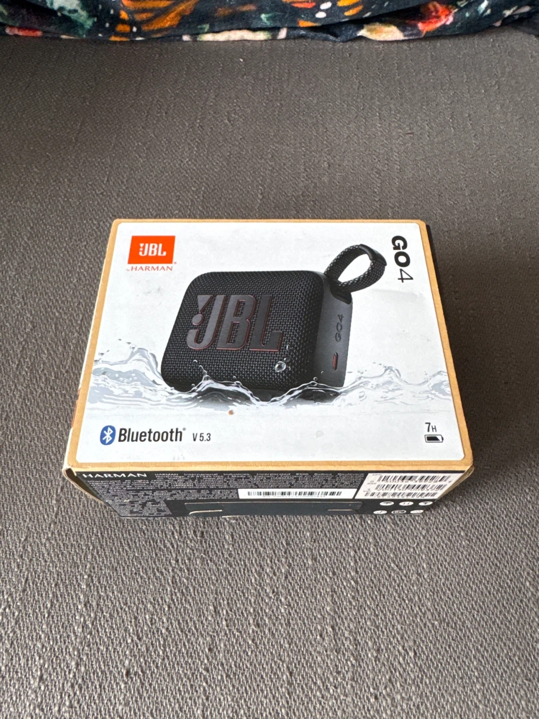 This is a JBL GO4 portable speaker. It features Bluetooth v5.3 connectivity and offers up to 7 hours of playtime. It's designed to be compact and durable for on-the-go listening.
