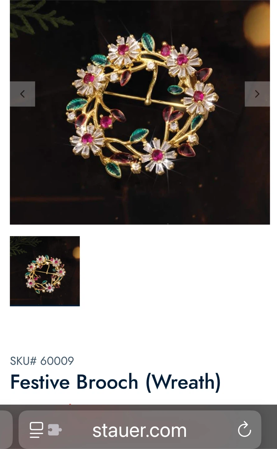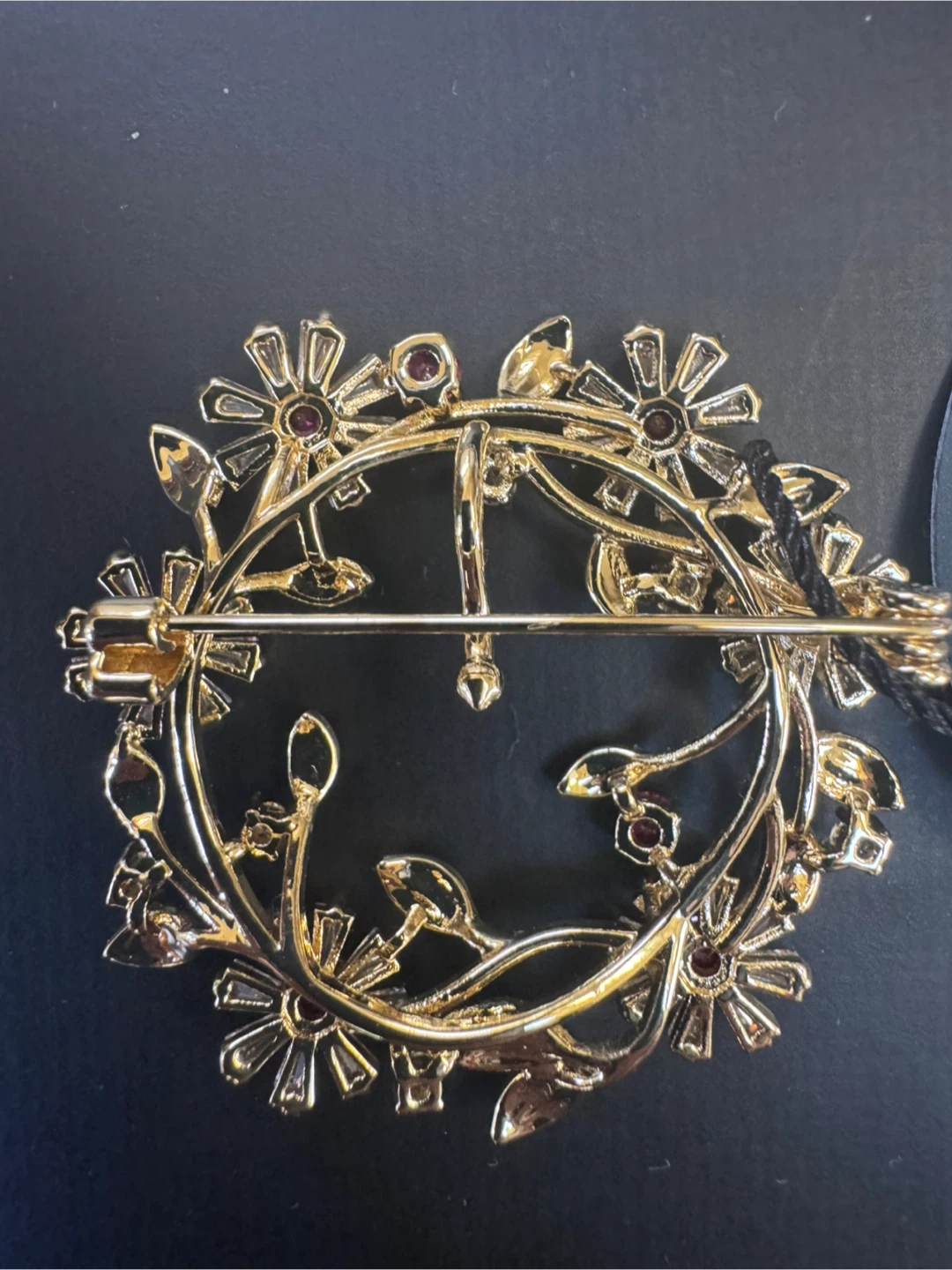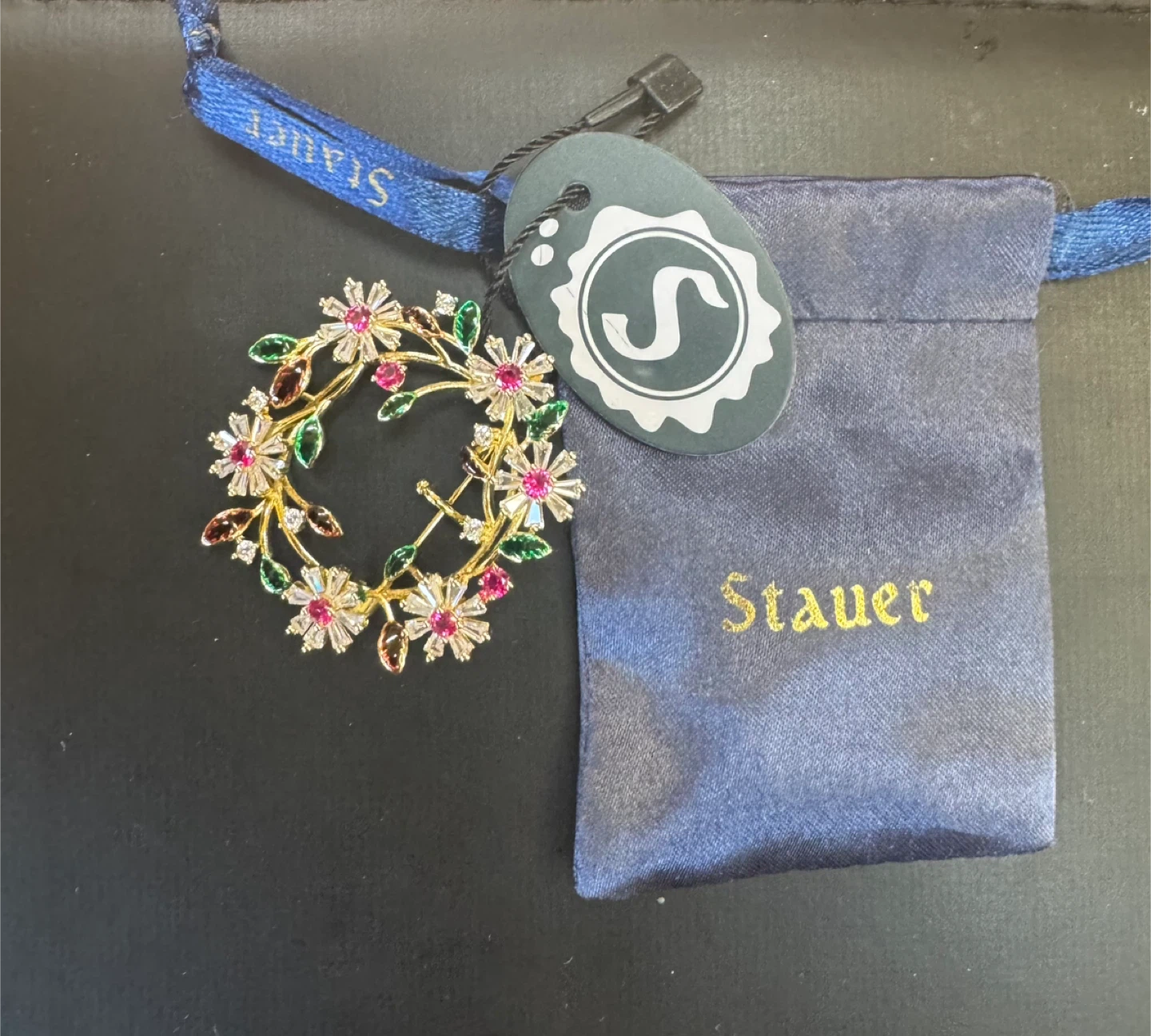 Think Spring! This Stauer Floral Wreath brooch features a delicate floral design with pink, green and clear accent stones. It's crafted with 14k gold plated brass . The brooch measures approximately 1.5 inches in diameter. Has bale to wear as pendant. Includes original pouch and tag. See specifications from www.stauer.com website