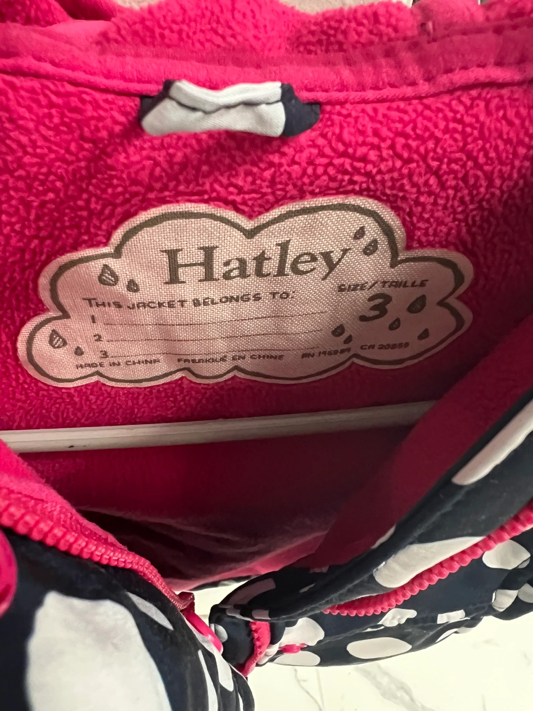Adorable Hatley jacket. Size 3. Polka dot print. Great for spring or fall. Features a hood and snap closures.