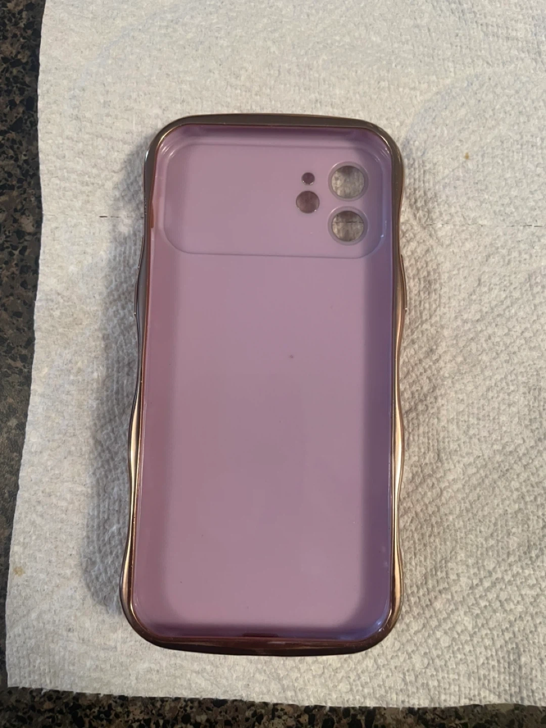 Selling a cute purple iPhone 12 case! It has a gold trim and a pop socket with a unicorn design. "Smile every day" is written on the case as well.