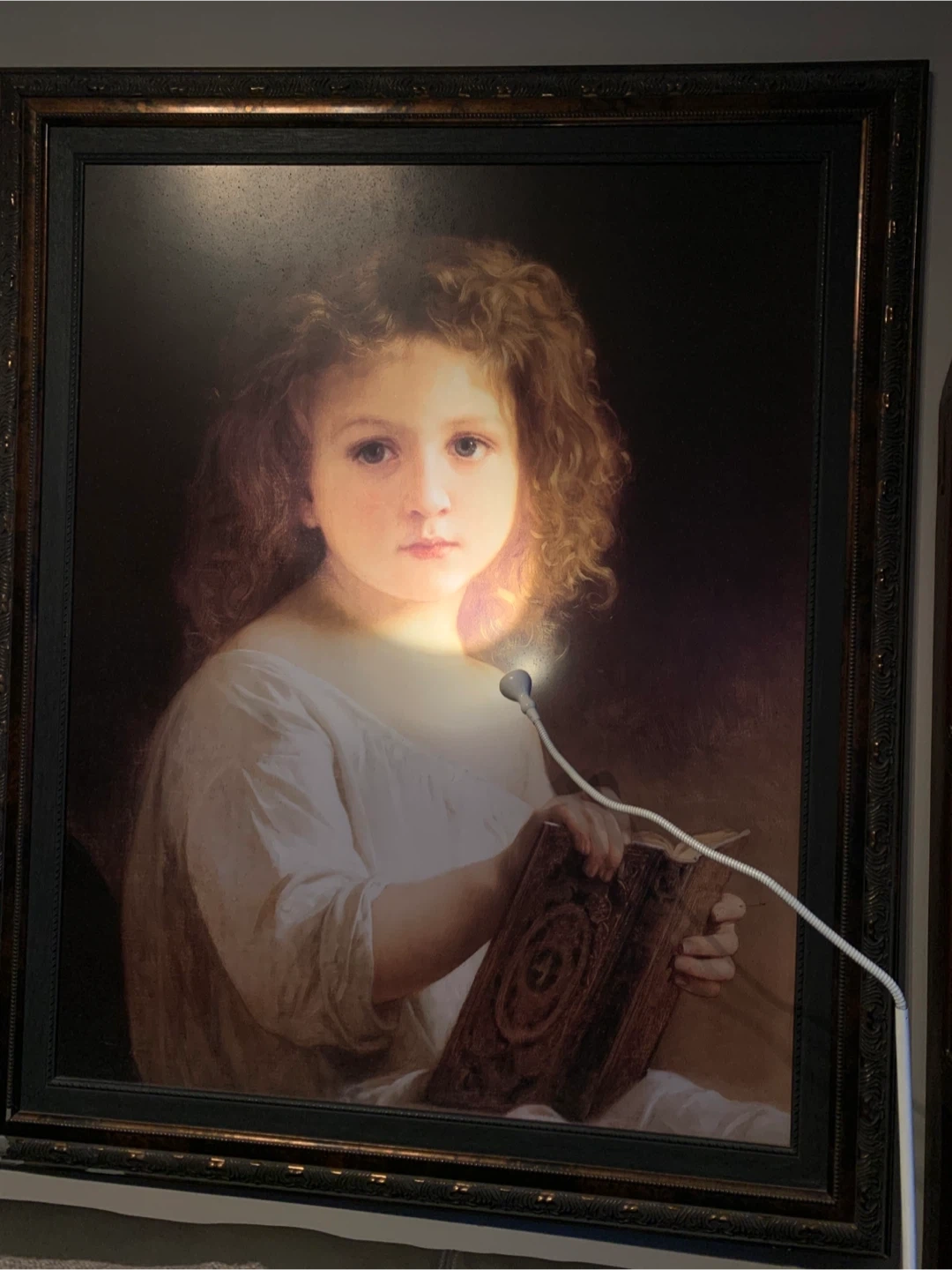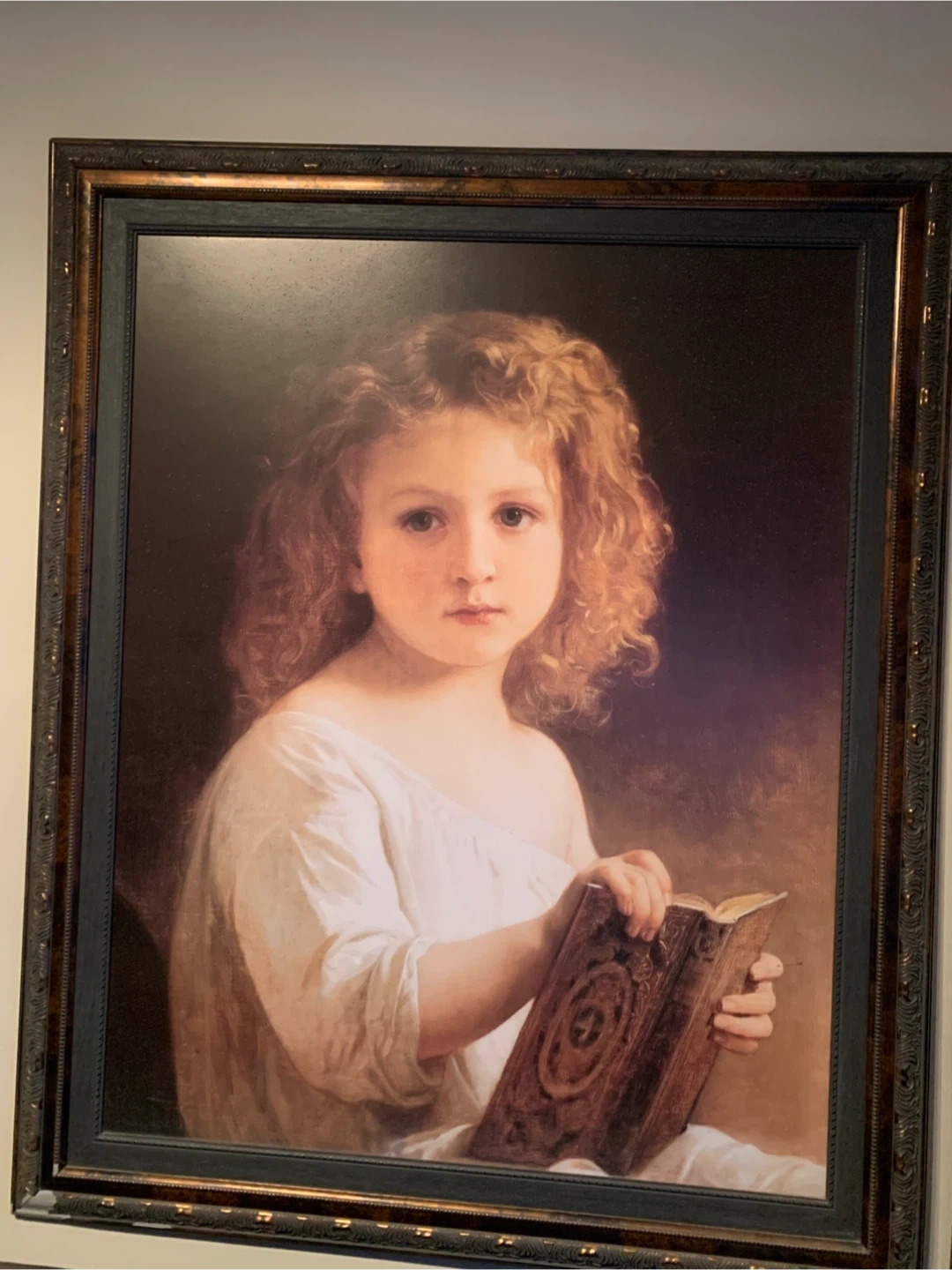 A vintage-style framed painting depicting a young girl holding an old book. It's a beautiful piece that would add a classic touch to any room. The painting is in a dark, ornate frame.