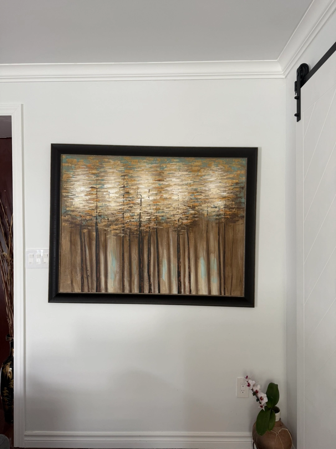 Selling this framed wall art. It's in great condition and would look lovely in any room. The frame is black and the art features a beautiful design with brown, gold, and blue tones