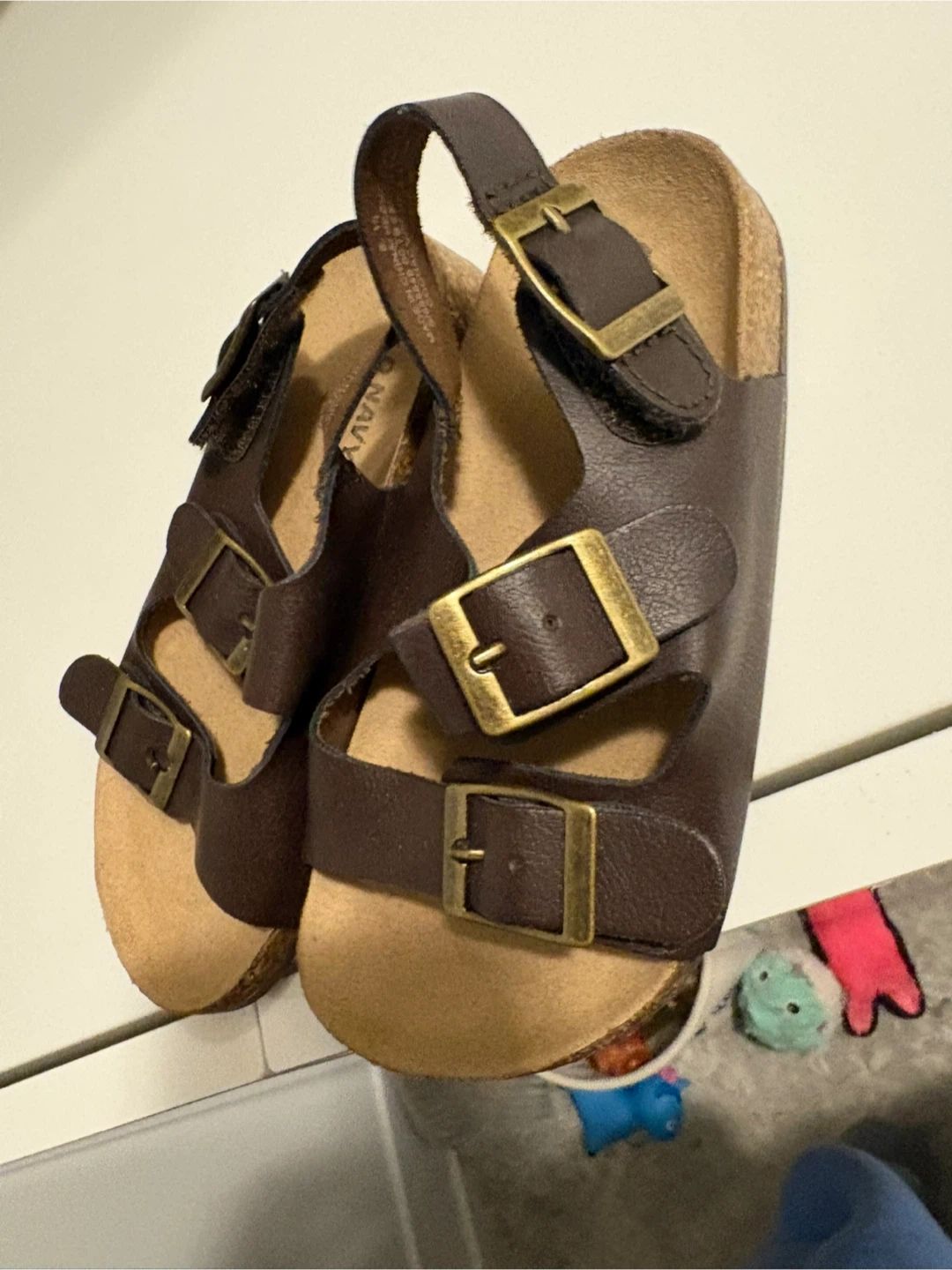 Classic brown Old Navy toddler sandals with adjustable buckles. Features a cork footbed and a durable rubber sole. These sandals are great for warm weather adventures!
