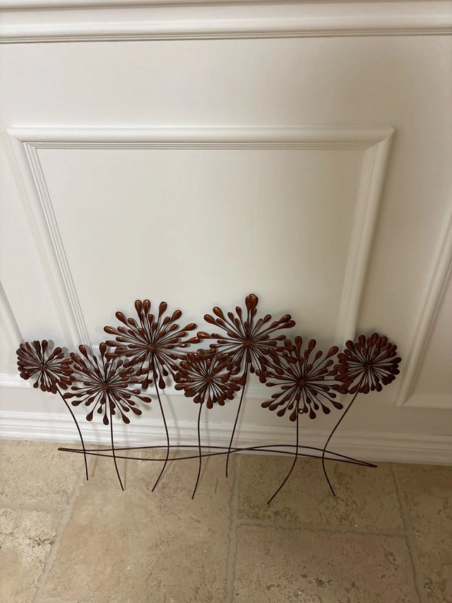 This used metal wall decoration features a floral design with a rustic, brown finish, perfect for adding a touch of nature-inspired art to any room. The dandelion design is sure to bring compliments. Style: Floral, Material: Metal, Colour: Brown. Spruce up your space with a bit of whimsy! If the ad is up, the item's available. I've priced this piece at $25, which represents great value for a unique decorative item. Cash accepted.