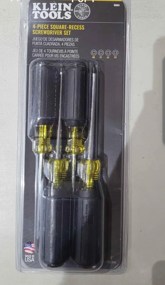 26Selling a brand new Klein Tools 4-piece square-recess screwdriver set! It includes four screwdrivers for square-recess screws, sizes #0, #1, #2, and #3. Made in the USA PRICE IS FIRM FIRST COME, NO HOLDS CASH ONLY