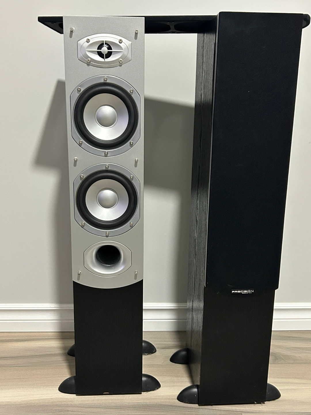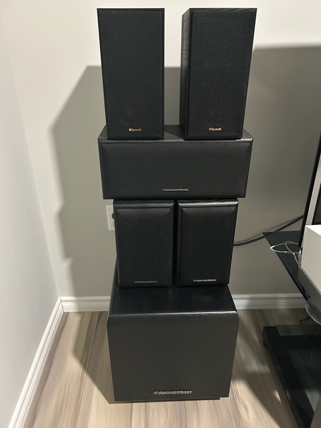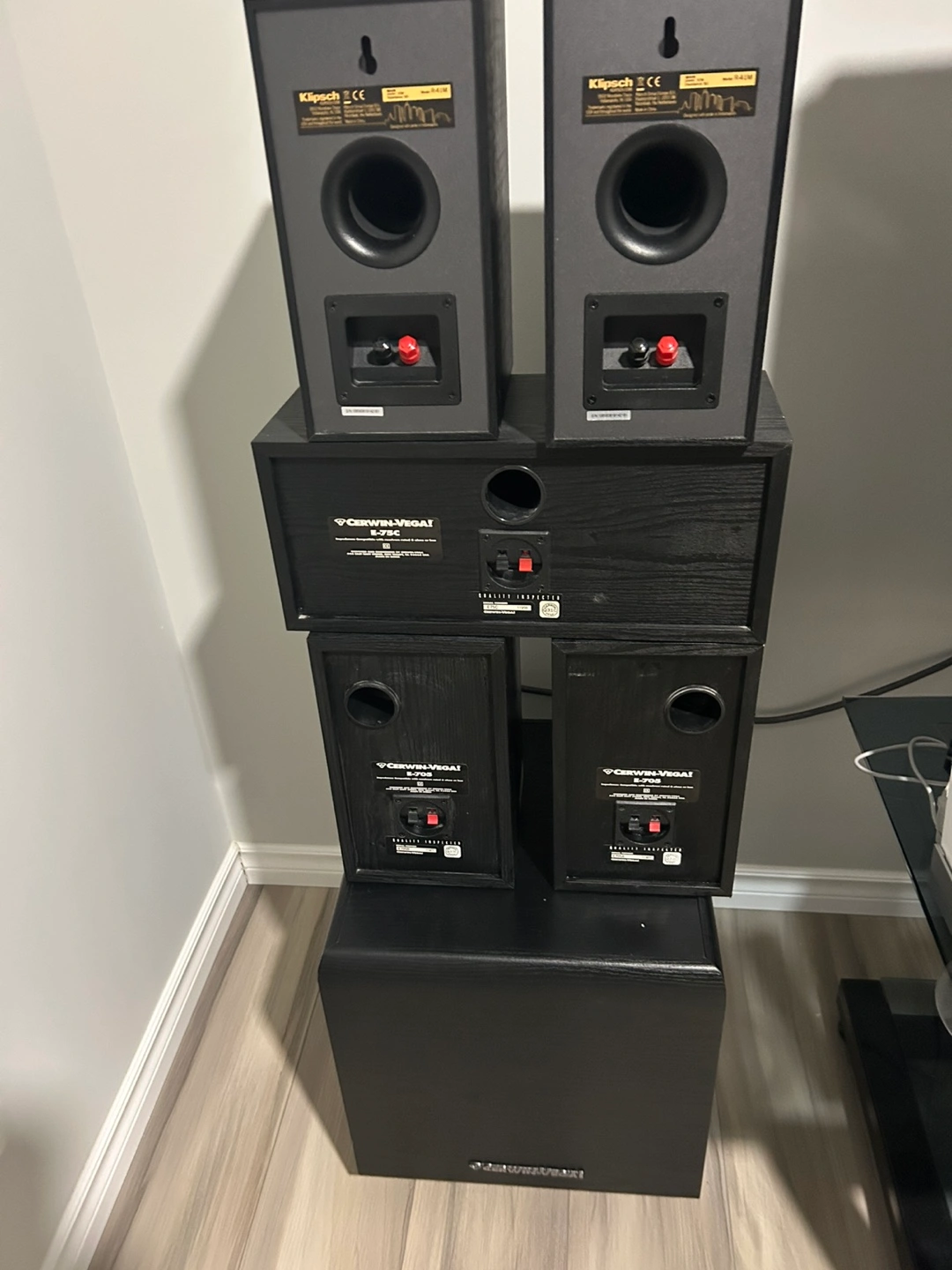 Selling a set of Klipsch speakers paired with a Cerwin-Vega subwoofer. They're in good condition and ready to bring some serious sound to your space! Home theatre 7.1 DTS master audio / Dolby true hd 1 hdmi out 4 hdmi in 10 inch powered sub HT-S10A 1 Center speaker cerwin Vega E75C 2 Cerwin Vega 12 inch bookshelf speakers E75C 2 - klipsch 12 inch R41M bookshelf speakers 2 tower speakers precision audio 550.00 CASH on pick up only Fergus No holds