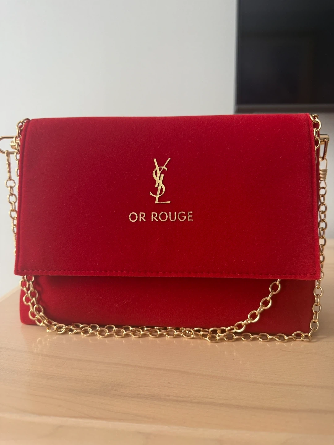 This is a red velvet clutch bag with a gold chain strap. It features the "YSL" logo and "OR ROUGE" text. It's perfect for a night out!