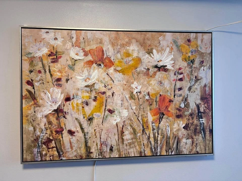 Dimensions: 37" x 25" x 2". Silver frame. Spotless. Pet and smoke-free home. Like new. This is the "Jostle" canvas art print by artist Jill Martin, featuring an abstract floral meadow design.