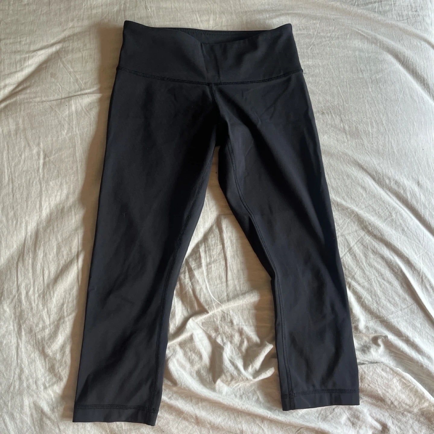 Lululemon cropped leggings in black. These comfortable leggings are great for workouts or everyday wear. The fabric is a stretchy, breathable blend. Size small. Perfect for gym wear or in the summer. Mint condition never worn, only selling because I have too many pairs.