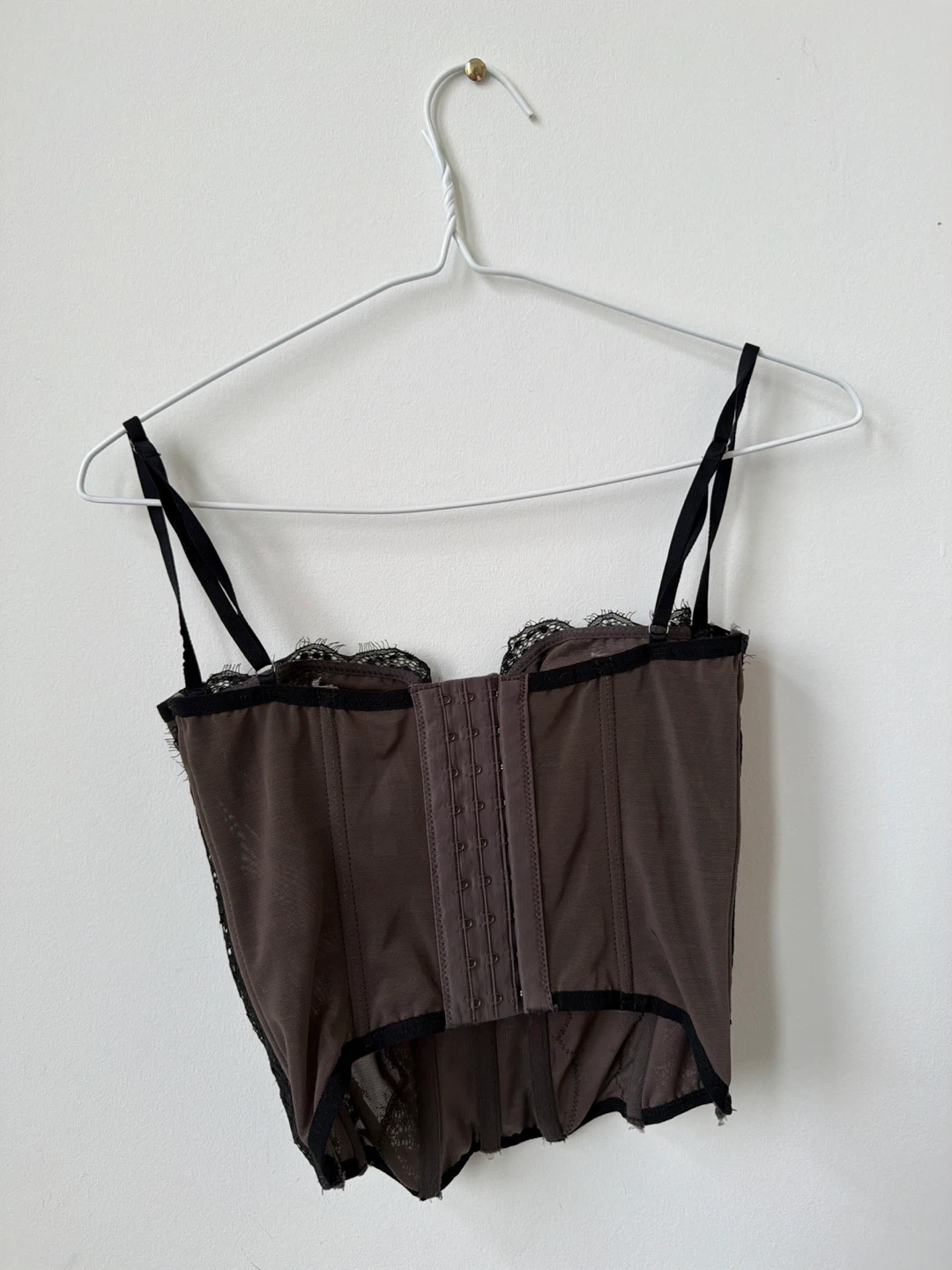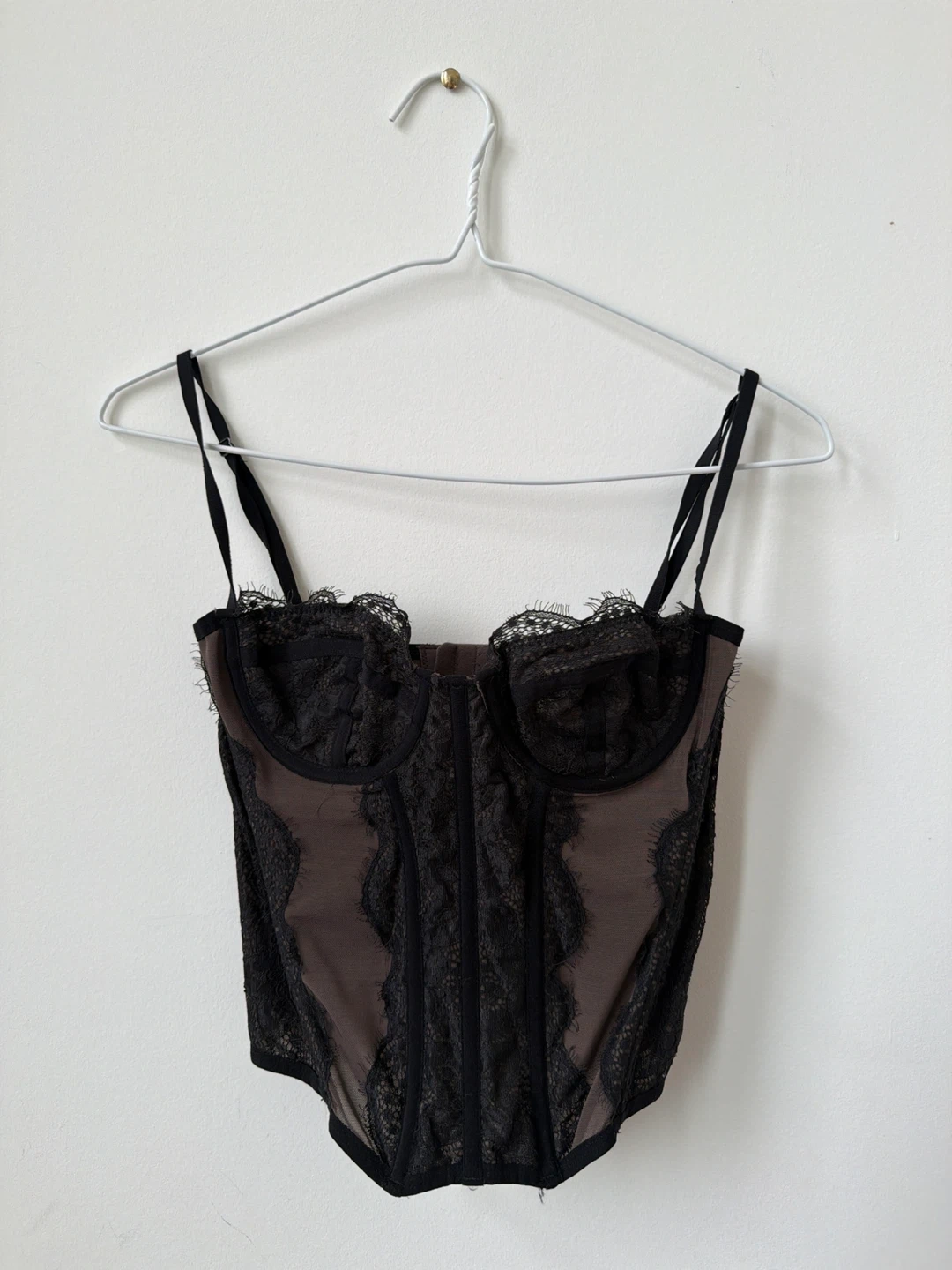 This is a black corset from urban outfitters in size medium. It features lace trim and adjustable straps. Made with a blend of materials for a comfortable fit. in great condition just one of the plastic rods are pointing out but can def be fixed!