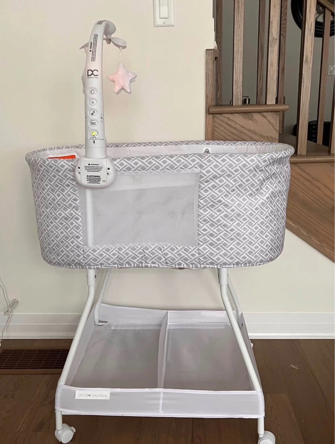 Bassinet has de mobile features spinning toys, a soft-glow nightlight, soothing sounds, vibrations and twinkle lights.