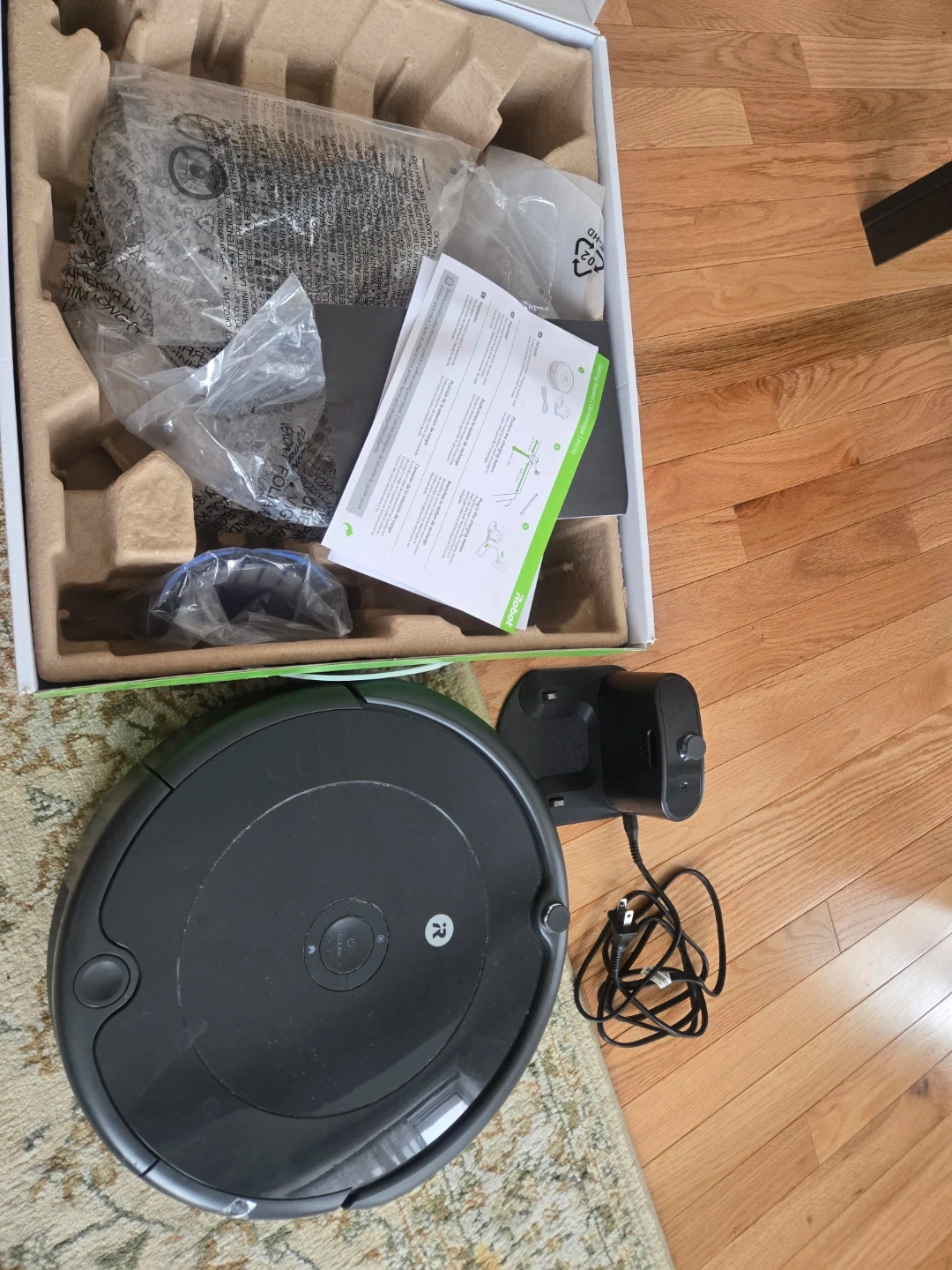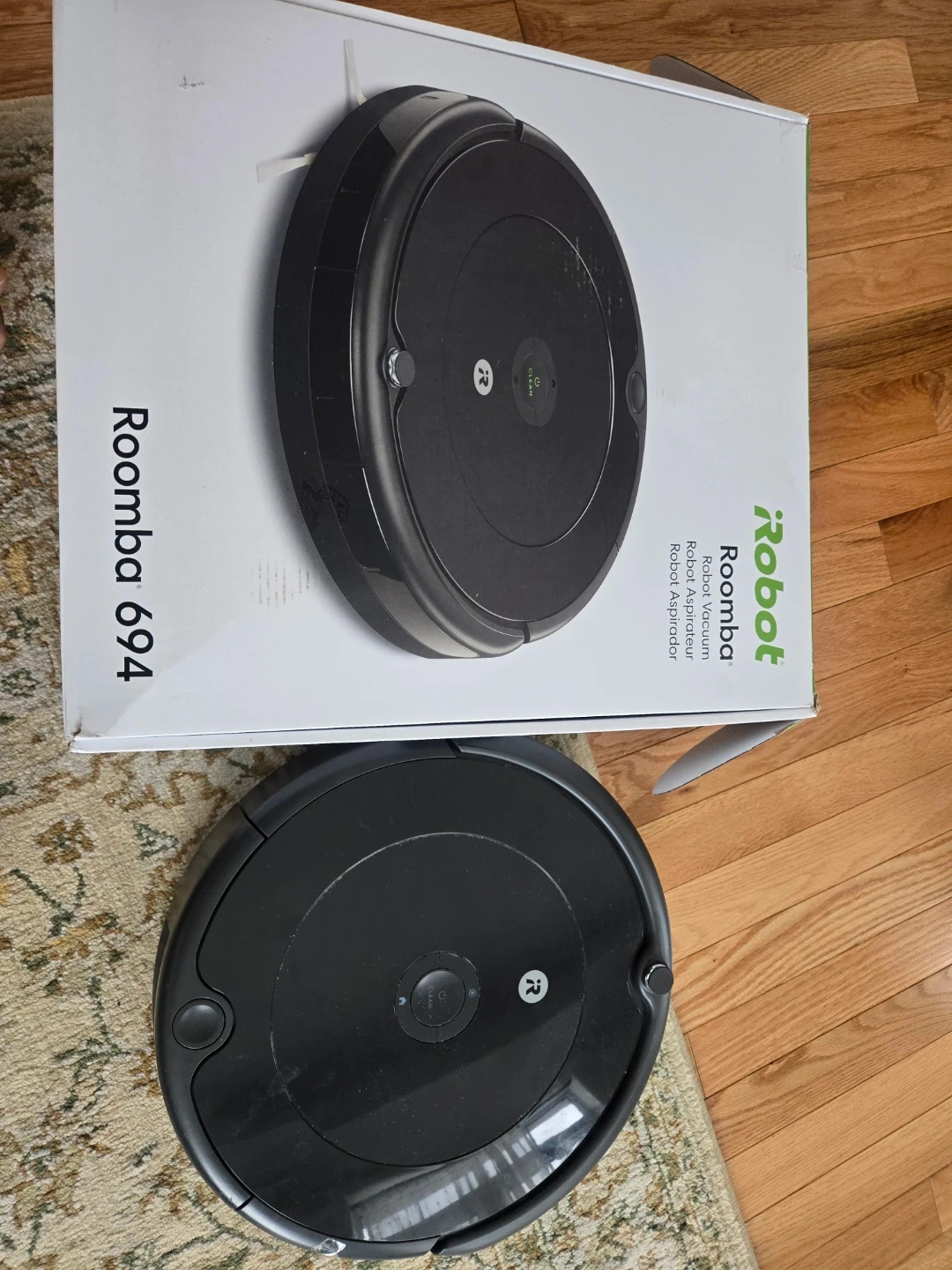 This iRobot Roomba 694 robot vacuum comes with its charging dock and power cord. It's black and works on carpets and hard floors. It's a great help for keeping your home tidy! I have one more so not using this much. It works well
