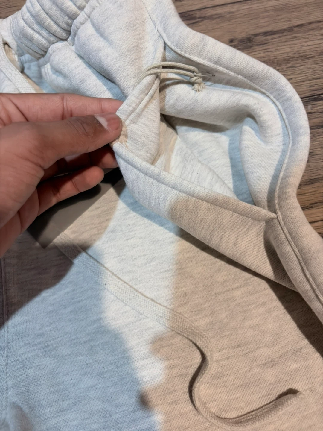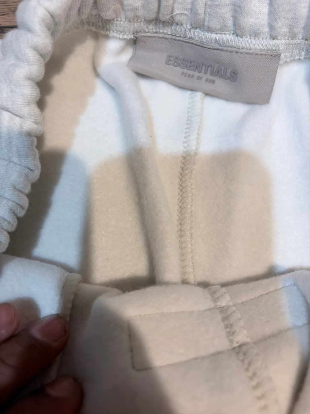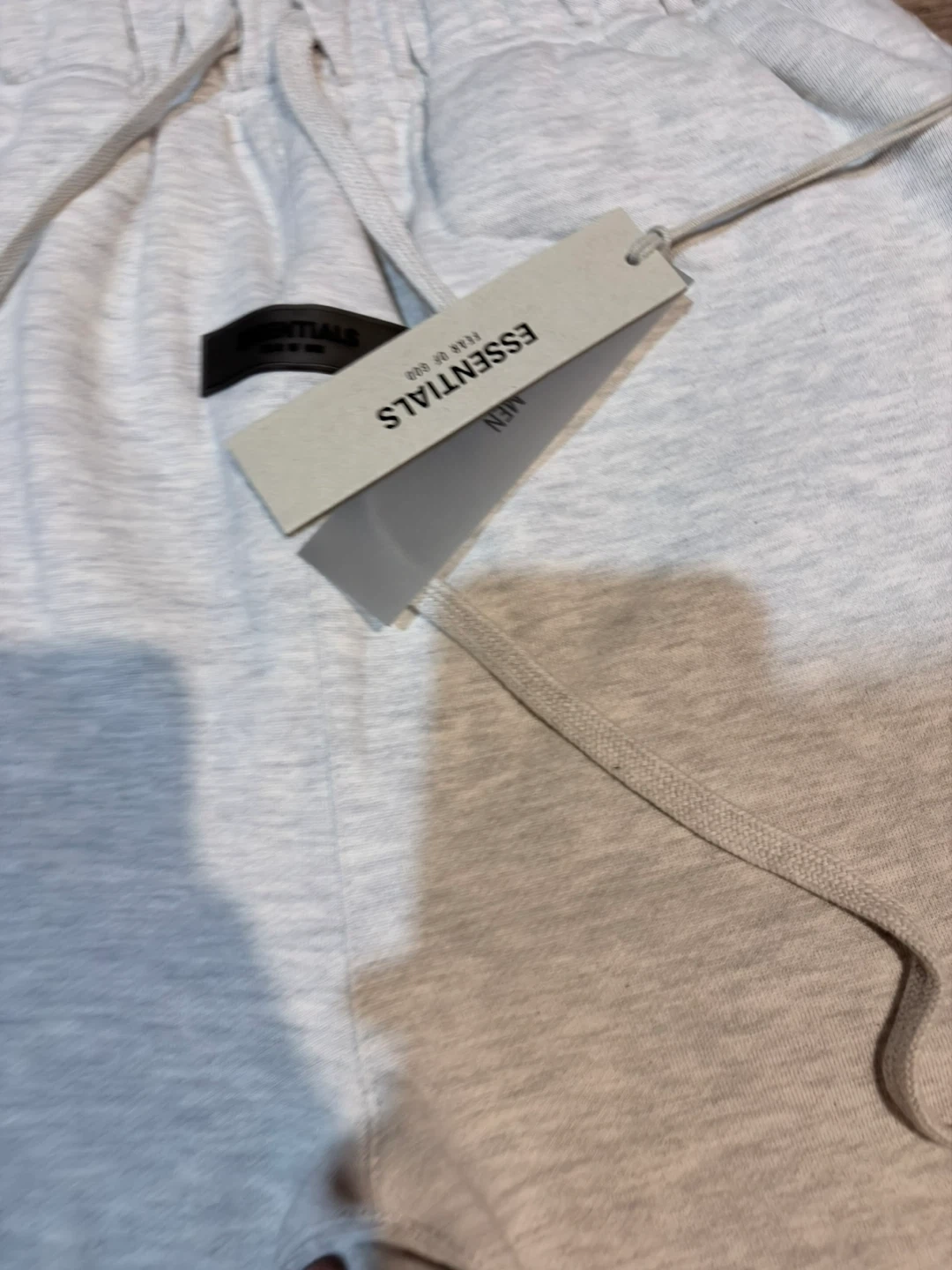 These are Fear of God Essentials sweatpants in a light heather grey colour. They're made from a soft, comfortable material perfect for lounging or casual wear. Features a drawstring waist and elastic cuffs for a snug fit.