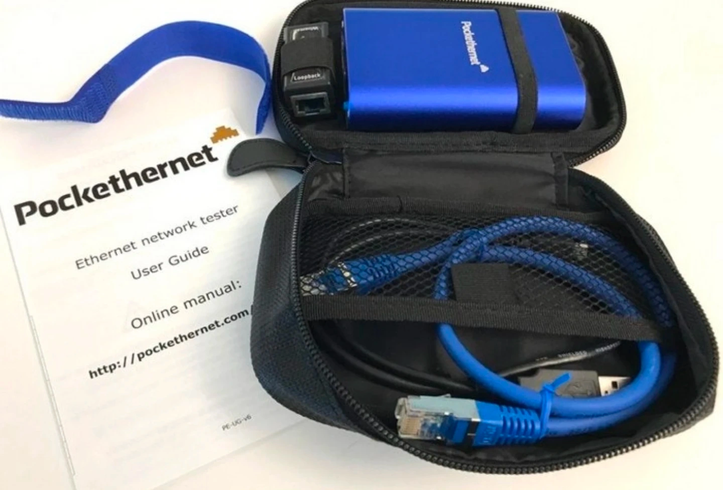 This Pockethernet is an Ethernet network tester. It's a compact device for testing network cables and connections. Includes user guide and necessary cables in a carrying case.