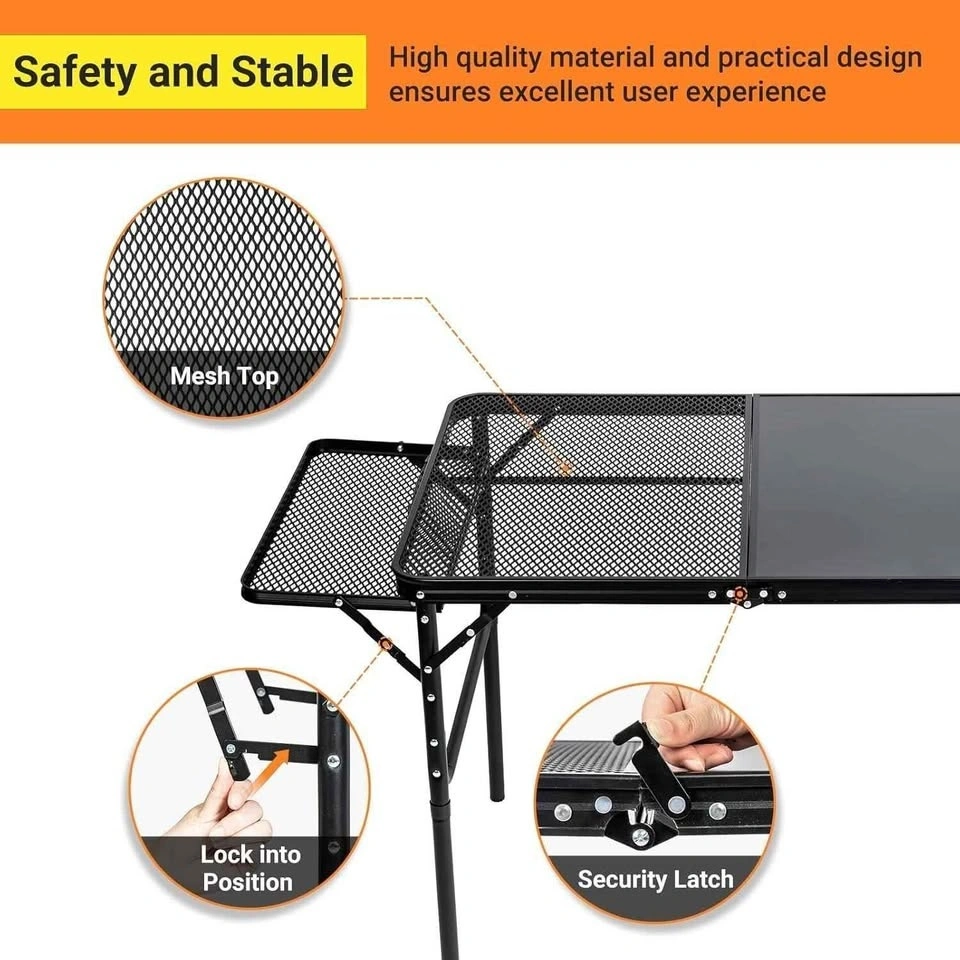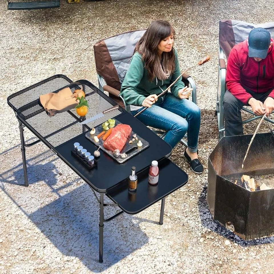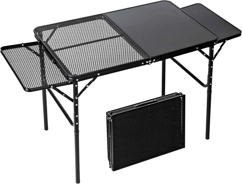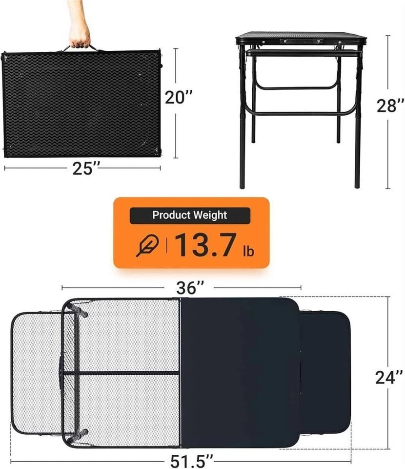 Super handy folding table. Great for camping, grilling, or just backyard hangs. Has a mesh top part, perfect for hot pans or letting stuff drain, plus solid surfaces for food prep. Folds up real compact, easy to take anywhere. Even has a handle when folded. Weighs just 13.7 lbs. When open, it's 51.5 inches wide, 24 inches deep, and 28 inches tall. Folds down to 25 inches by 20 inches. Sturdy build, locks secure when set up.