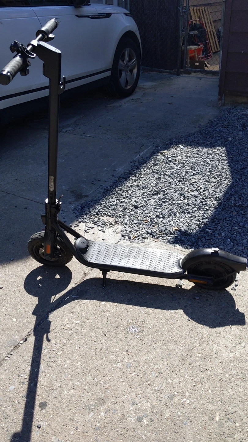This is a black Segway Ninebot ES2 electric kick scooter. It's a personal transporter. It has a foldable design for easy carrying. Great for commuting!