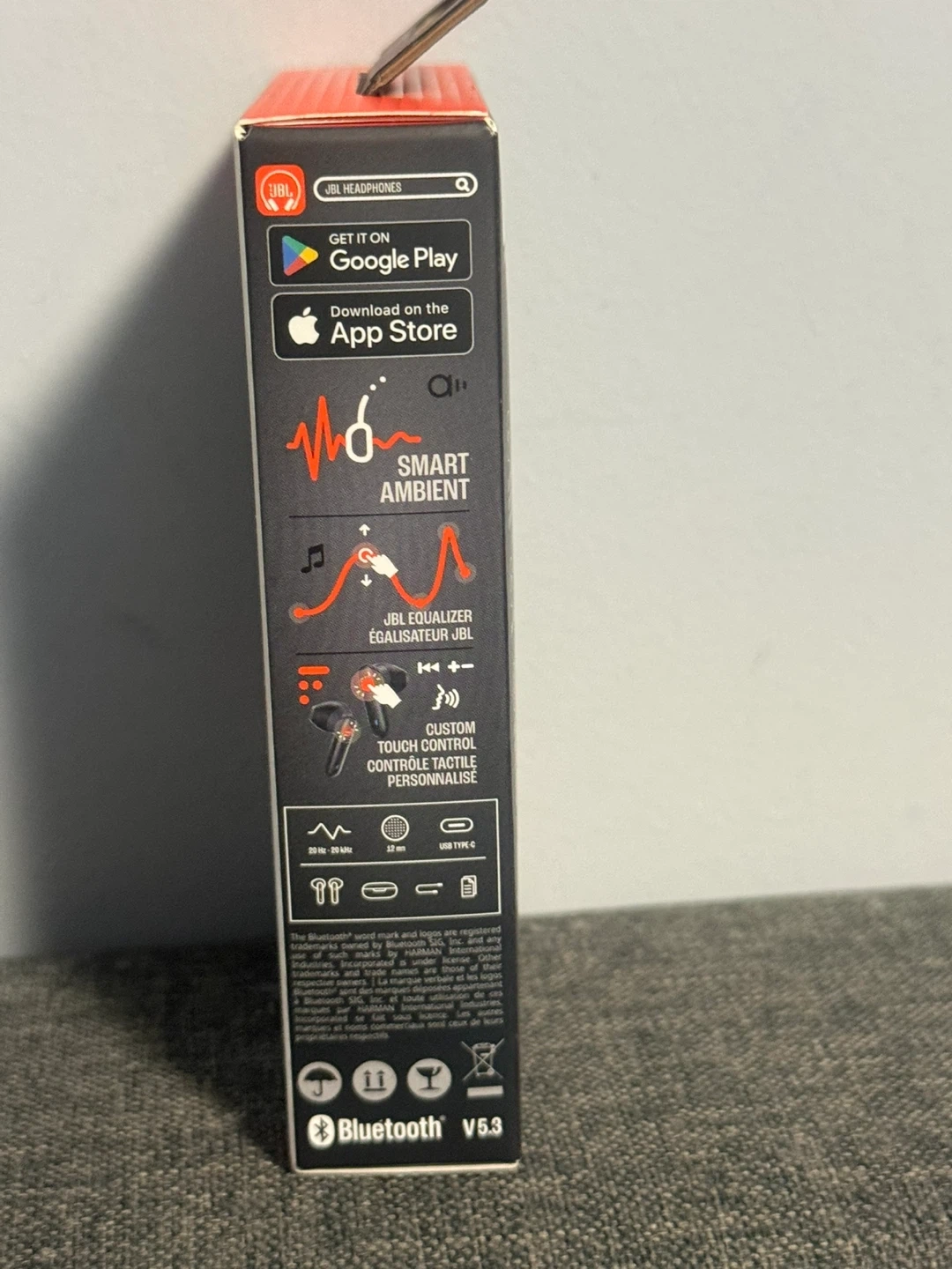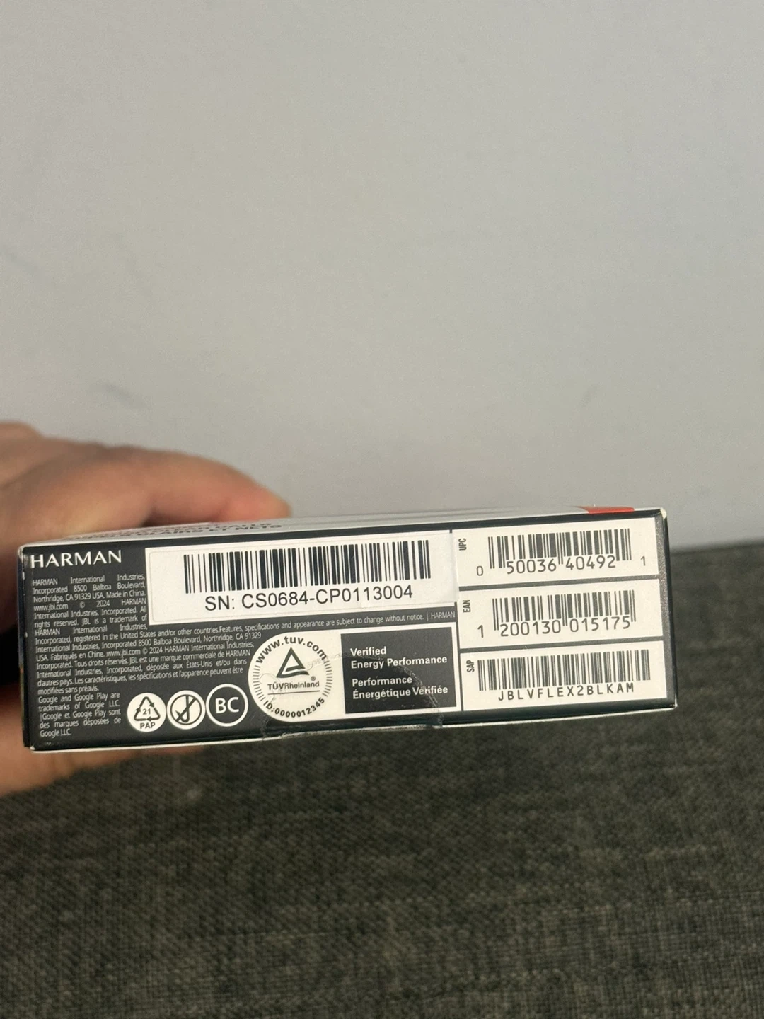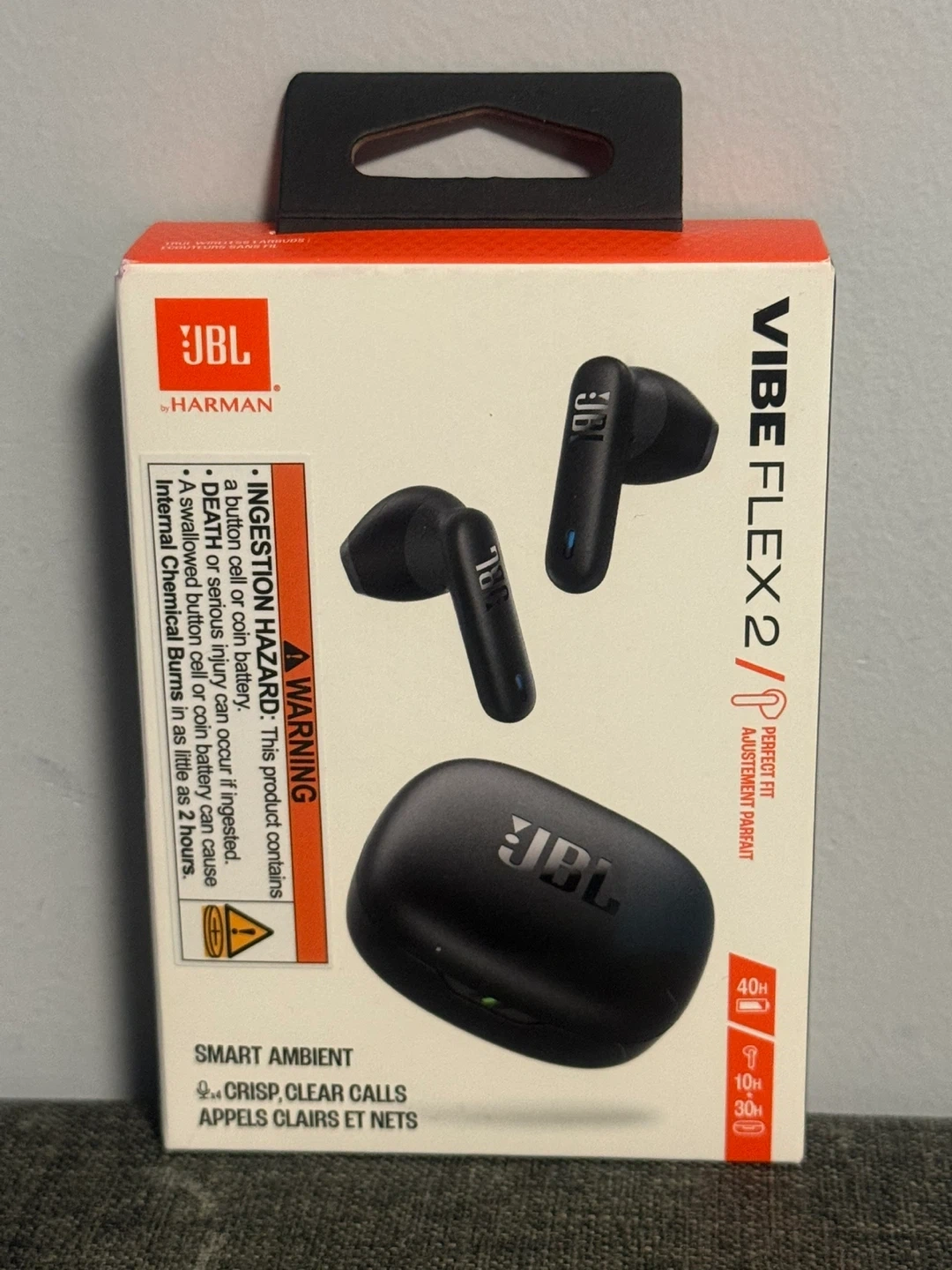 These are JBL VIBE FLEX2 wireless earbuds. They have a black colour and offer smart ambient sound and crisp, clear calls. Included is the charging case for up to 40 hours of playback.