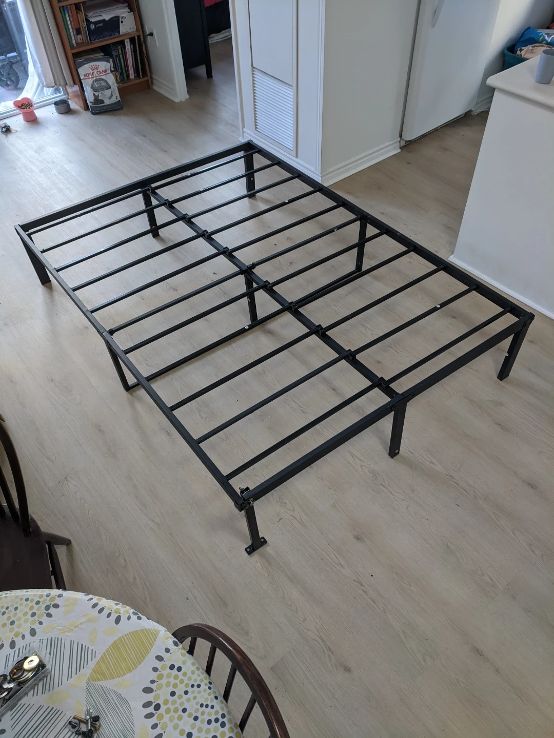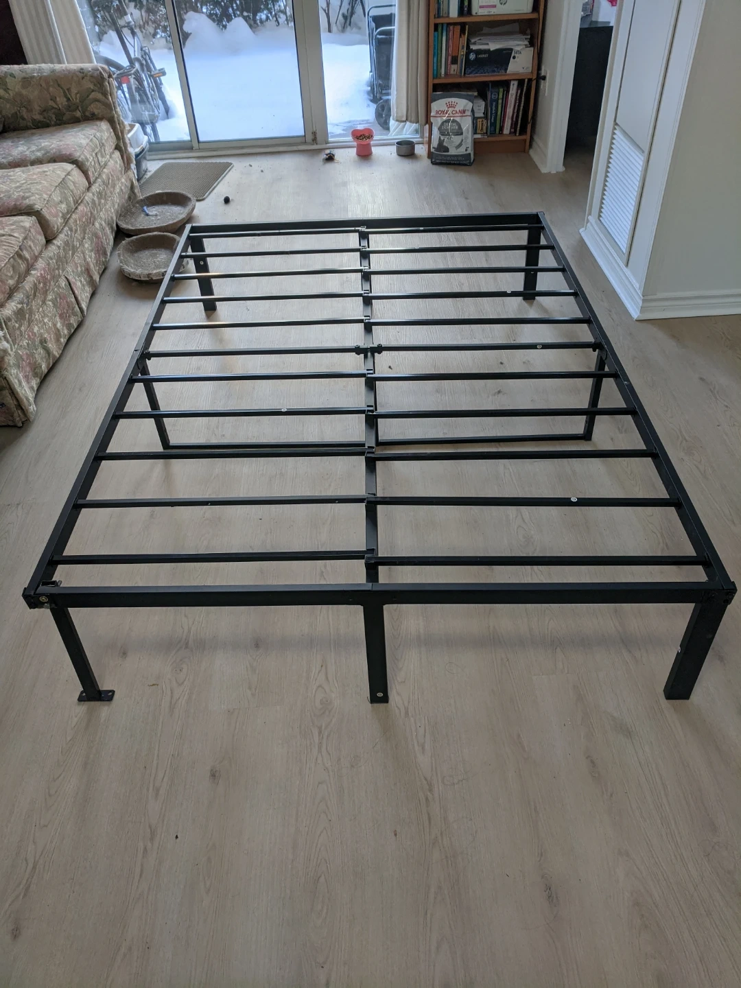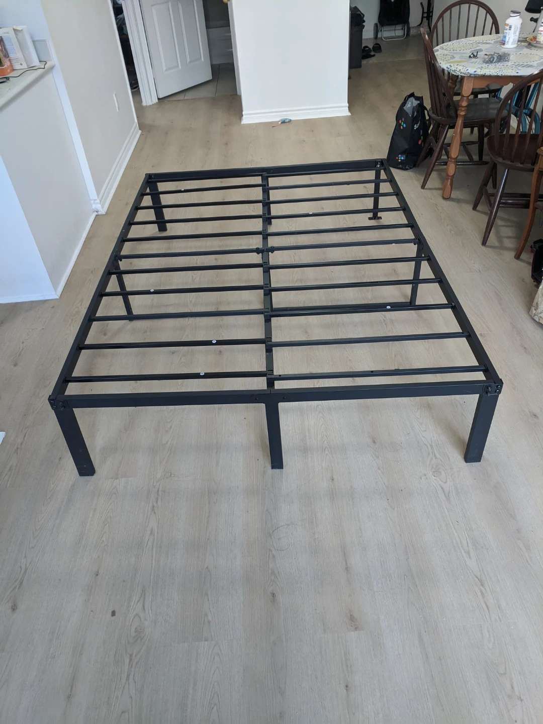 This is a black metal double bed frame. It features a sturdy metal construction with multiple support slats. Assembly is required, but it's straightforward. Noting: a bed leg is different from others. But it doesn't matter.I can deliver it to your house and fix it for you. The delivery is free!!