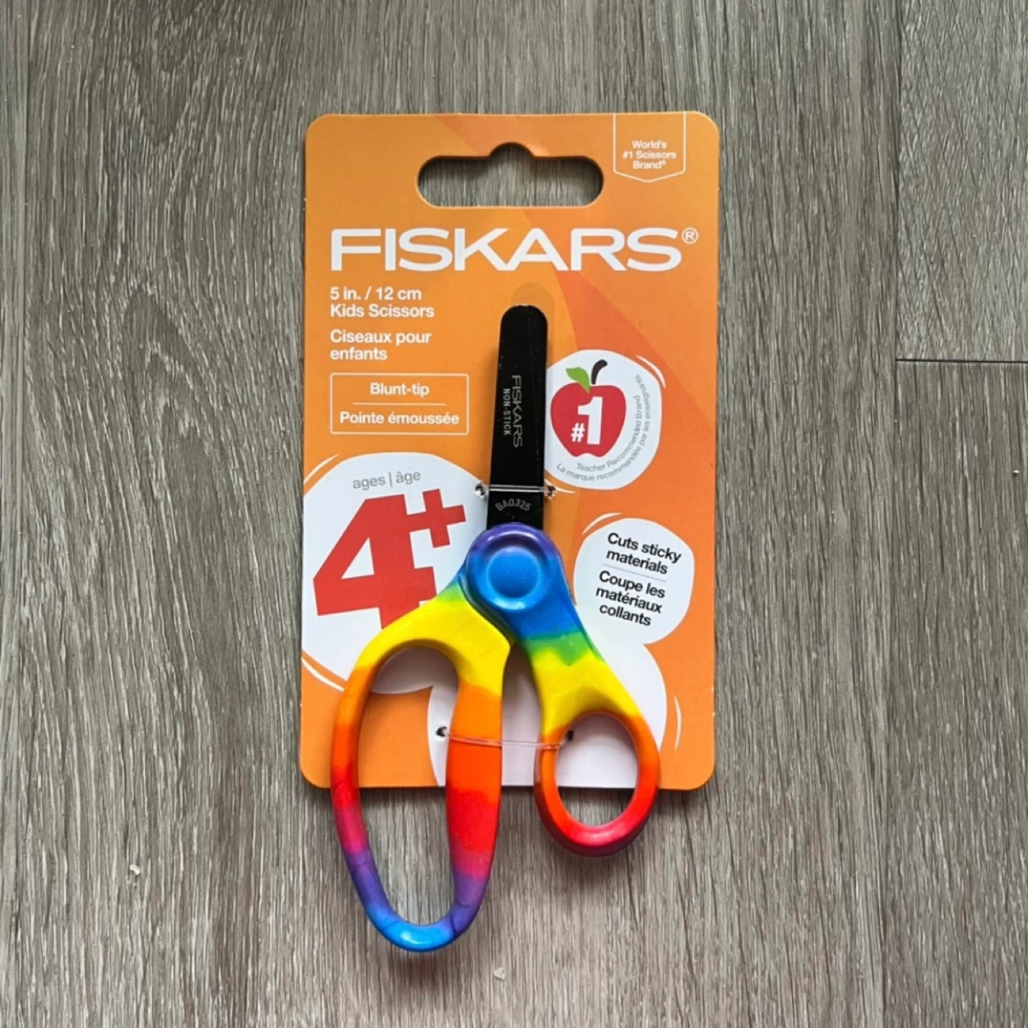 Fiskars 5 inch kids scissors with a rainbow handle. They're blunt-tip. These scissors are recommended for ages 4 and up.