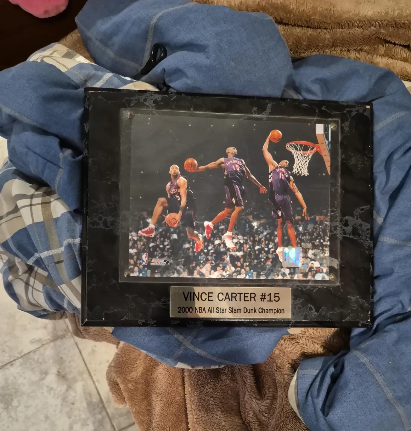 Framed photo commemorating Vince Carter's 2000 NBA All-Star Slam Dunk Championship win. Features multiple action shots of Carter in his Toronto Raptors uniform. Includes a descriptive plaque with his name, number 15, and the event details. Perfect for any basketball fan or collector!