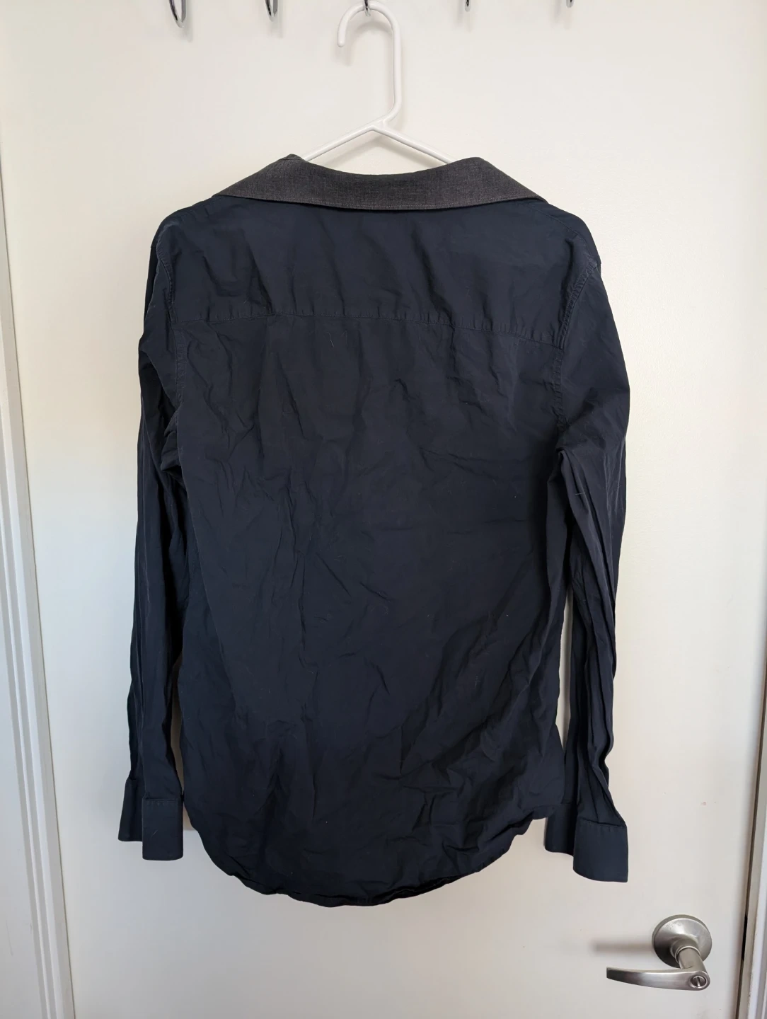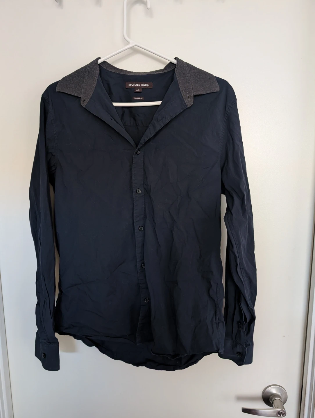 Classic navy button-up shirt from Michael Kors. It's a tailored fit with a contrasting grey collar. Long sleeves with button cuffs.