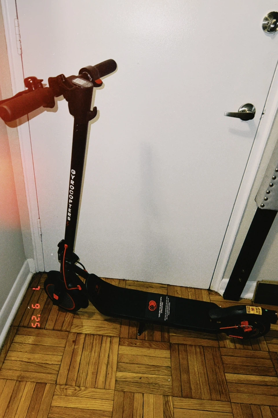 GYROCOPTERS electric scooter in black. It's a fun way to get around town. This scooter's deck is wide, providing stability. It has a foldable design for easier storage and transport. Great for commutes or just cruising!