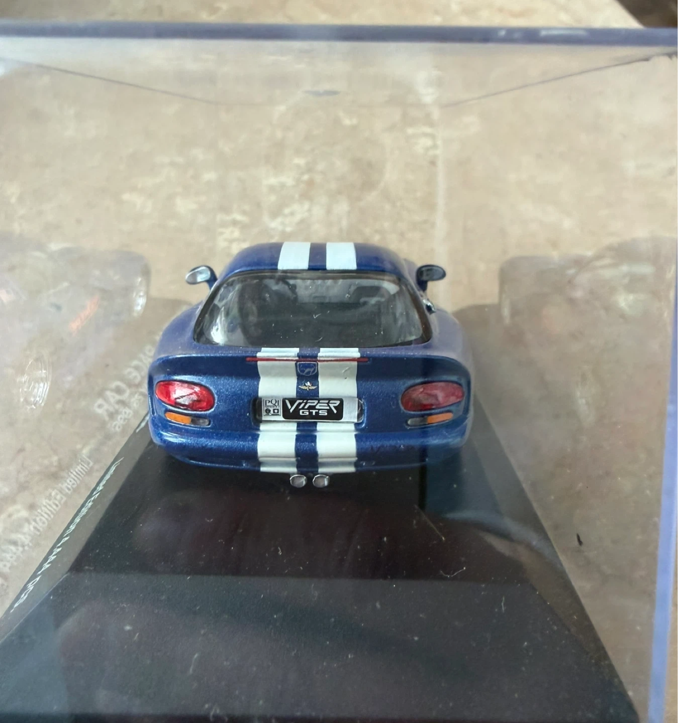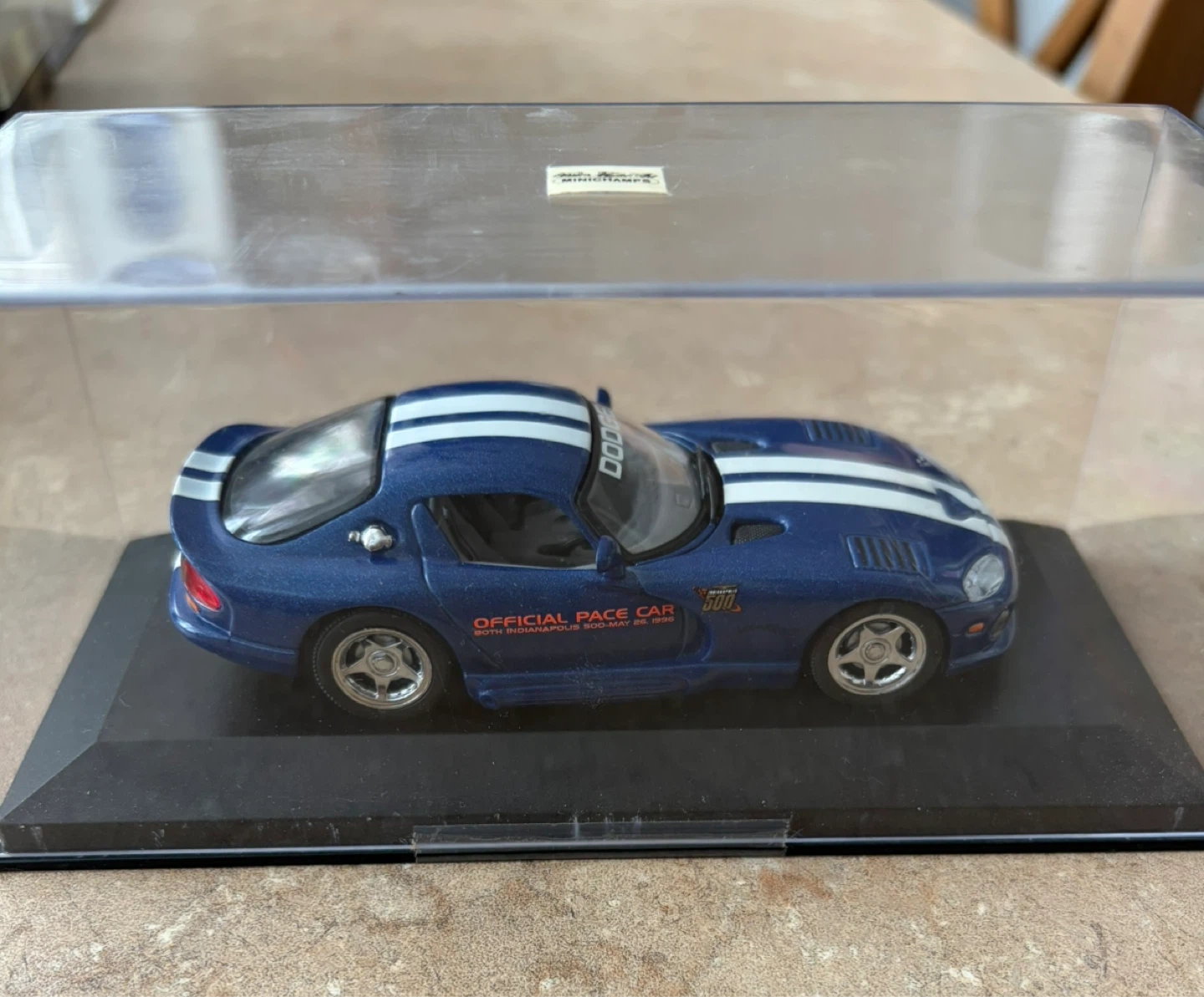 This is a 1996 Dodge Viper GTS Official Pace Car diecast model. It's a limited edition of 4,444 pieces commemorating the 80th Indianapolis 500 on May 26, 1996. The model is blue with white racing stripes.