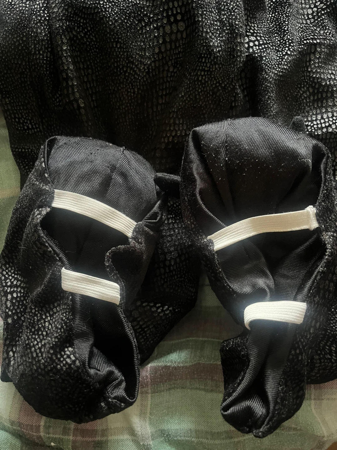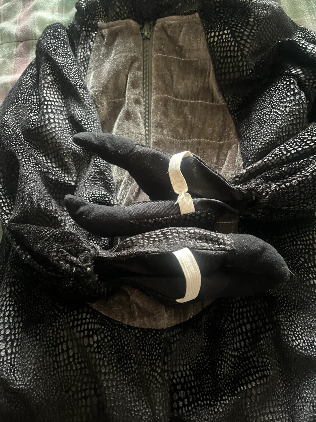 A fun dinosaur costume for kids! It's in great shape and ready for dress-up or Halloween. Includes the full body suit with attached hood, tail, and shoe covers, plus the matching gloves. Roar!