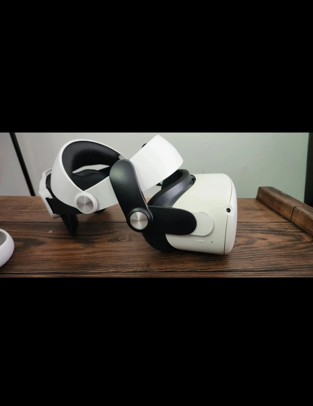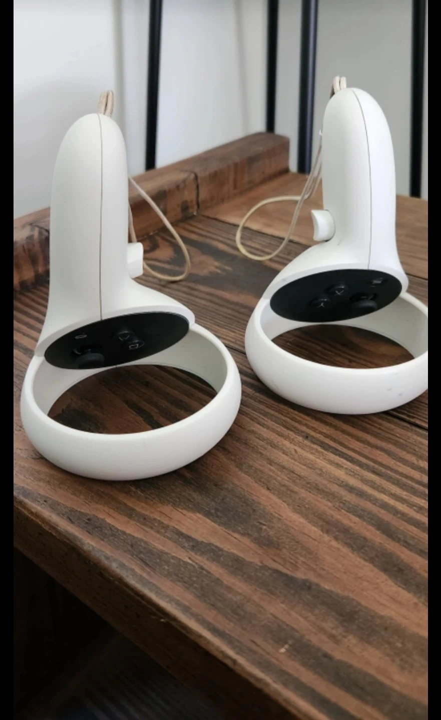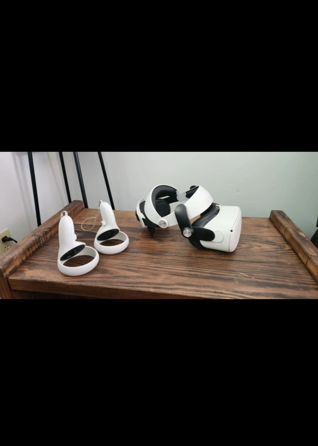 This is a Meta Quest 2 virtual reality headset and two controllers. It's a white, all-in-one VR system. The headset features adjustable straps for a comfortable fit. Like new condition. $150.
