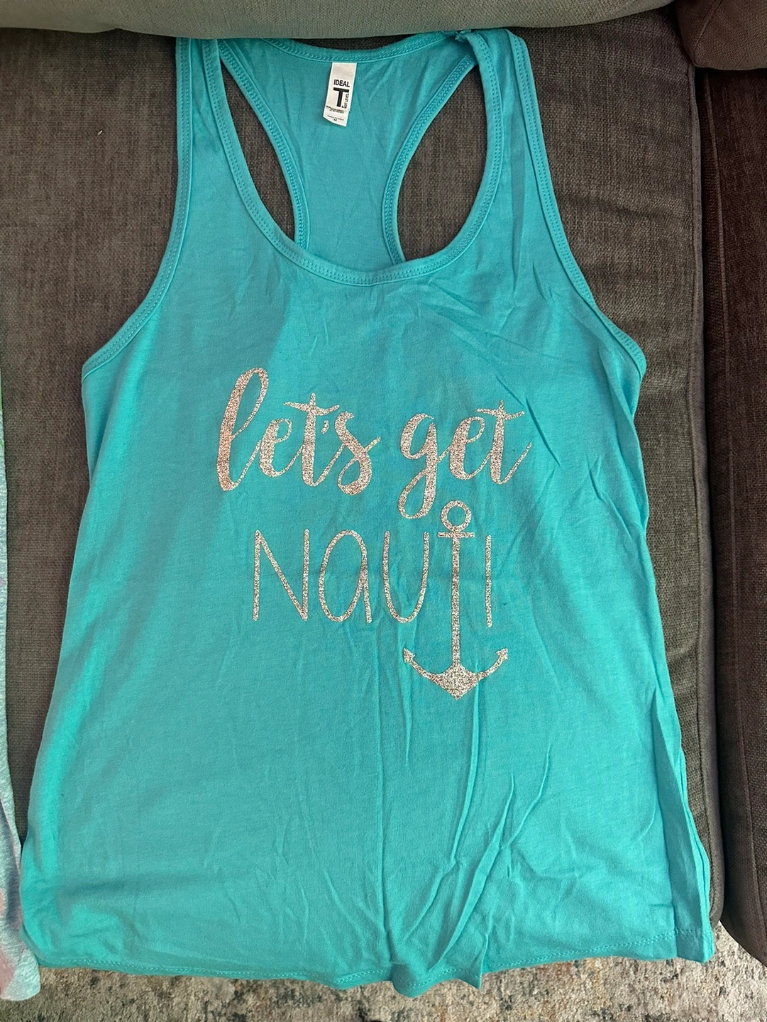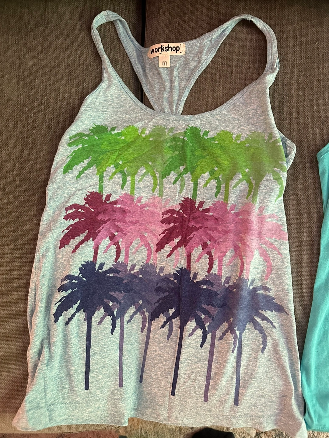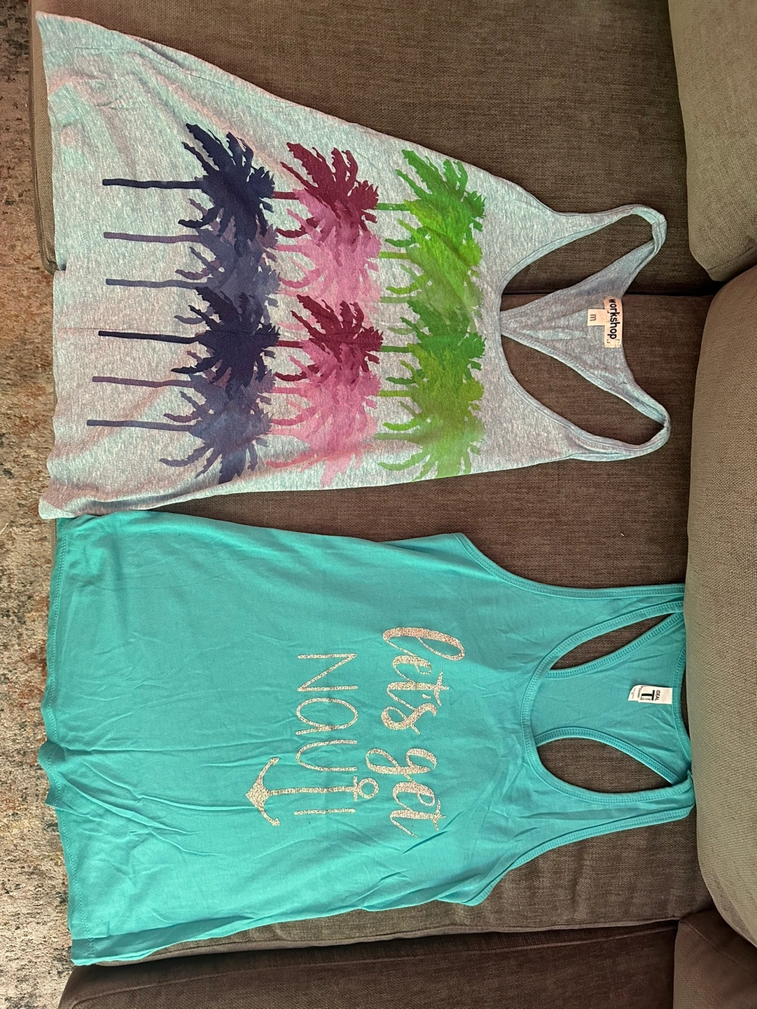 Two women’s medium tank tops (all teal tank top only worn once, light blue tank top with palms trees is gently used)