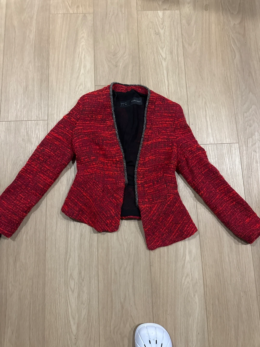 This ZARA BASIC blazer is a vibrant red tweed. It features a textured fabric and a subtle metallic trim along the neckline. It's fully lined with black fabric. The jacket has a modern, tailored cut.