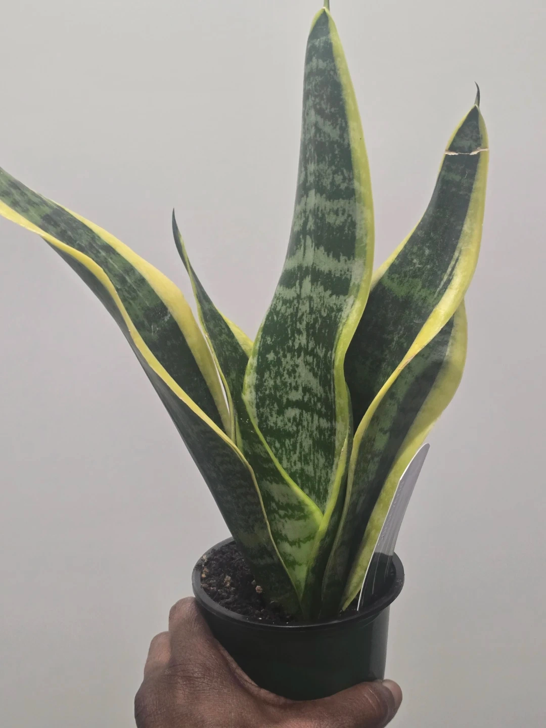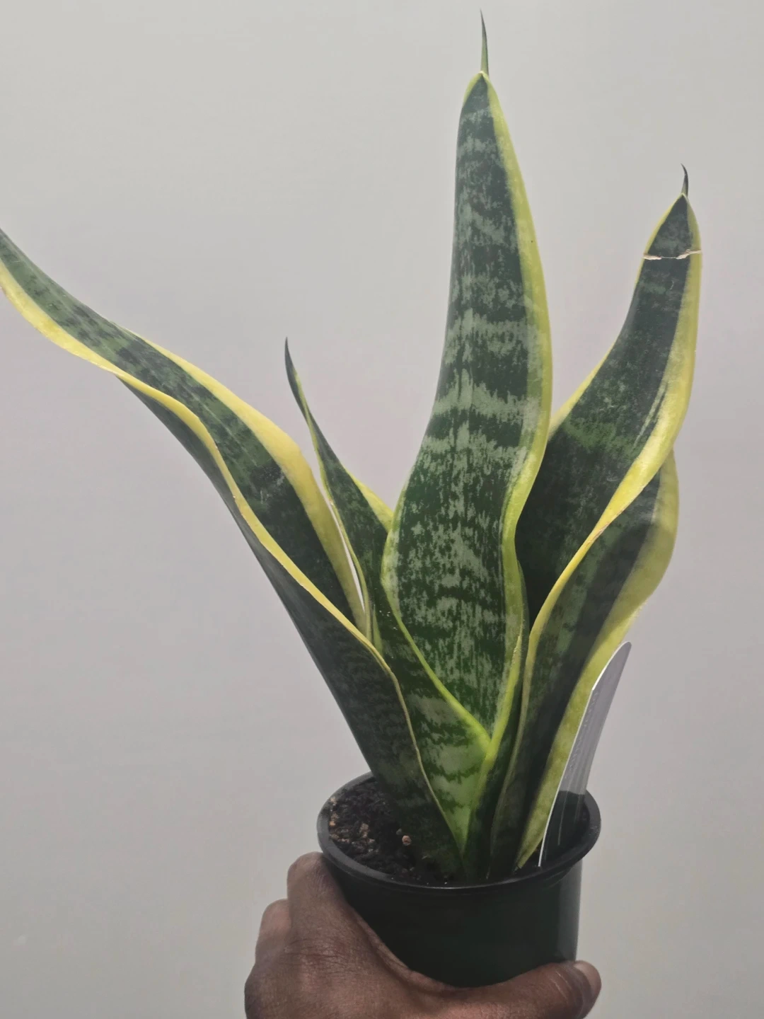 Durable and low-maintenance potted snake plant with variegated green and yellow leaves. It's a compact variety, perfect for small spaces or as a desk plant. These plants are known for their air-purifying qualities!