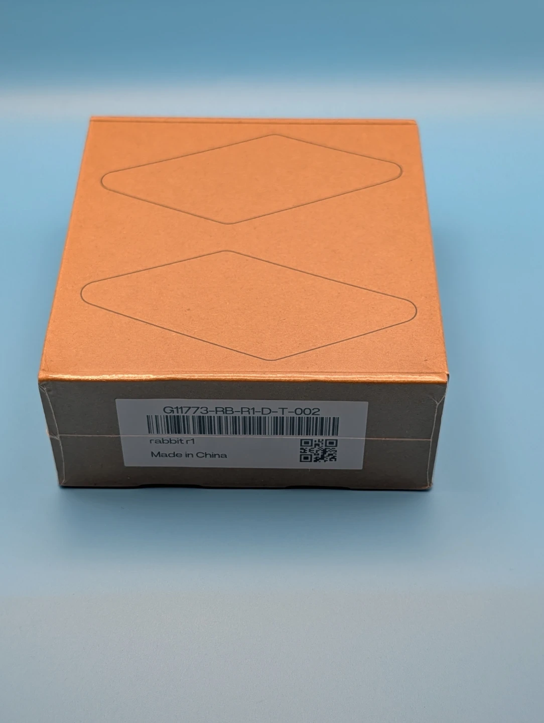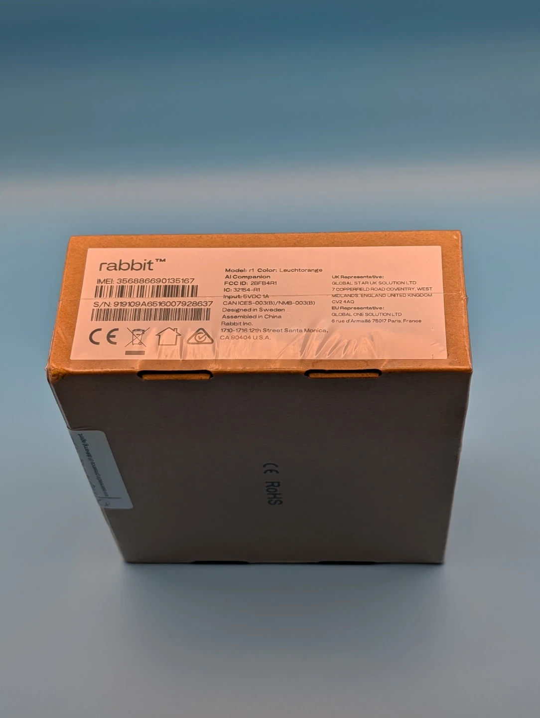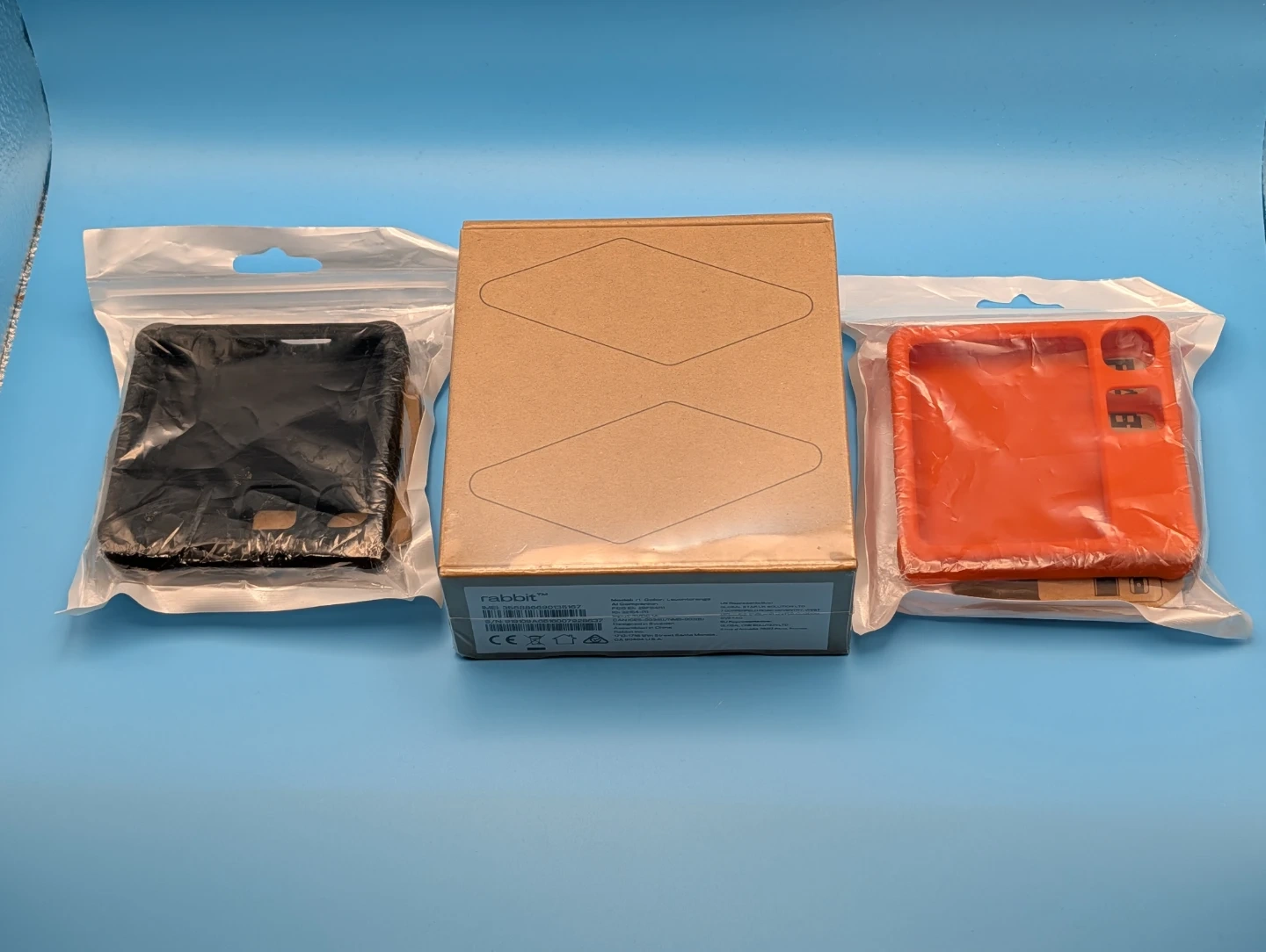 This is a Rabbit r1 AI Companion device in the colour 'Lauch orange'. It comes with black and orange silicone cases. The device is made in China.