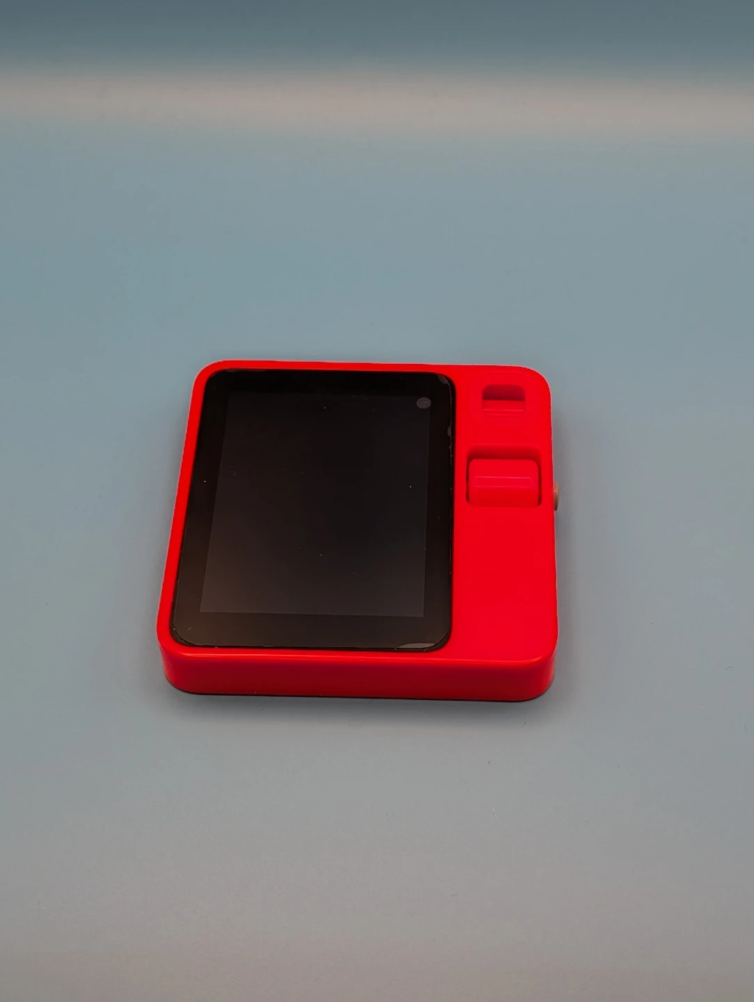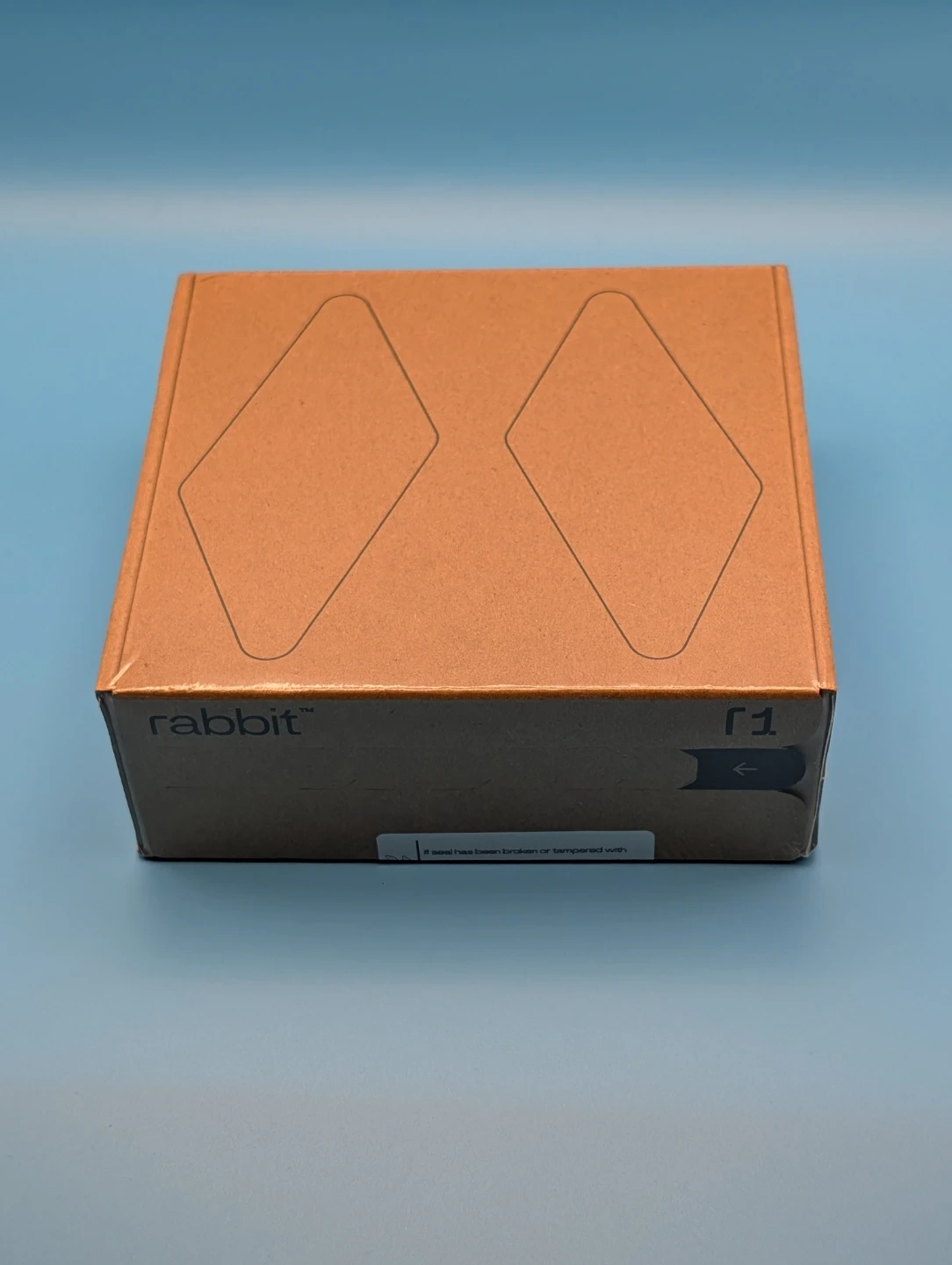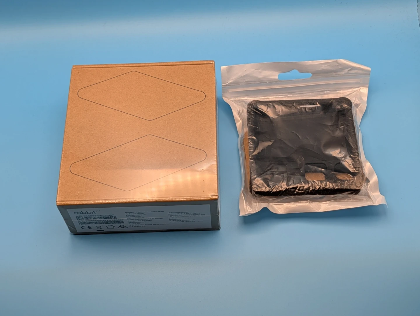 This is a Rabbit r1 AI Companion device in the colour 'Lauch orange'. It comes with black and orange silicone cases. The device is made in China.