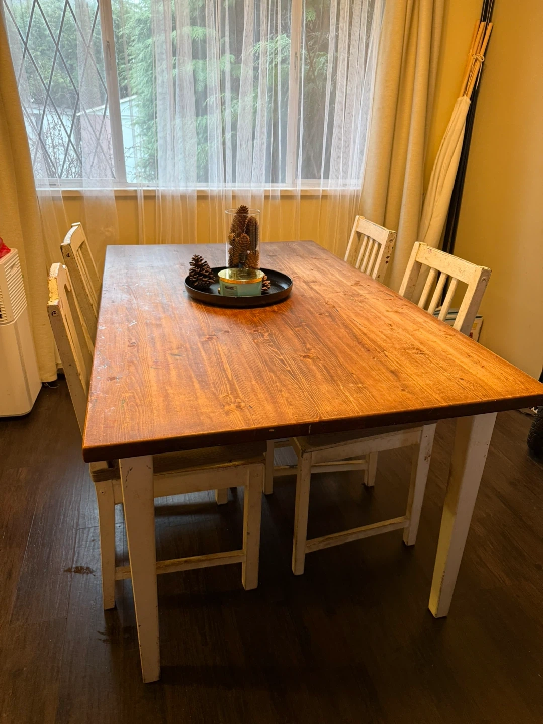 An IKEA table-sanded and painted to create a rustic wooden dining table with four chairs.
