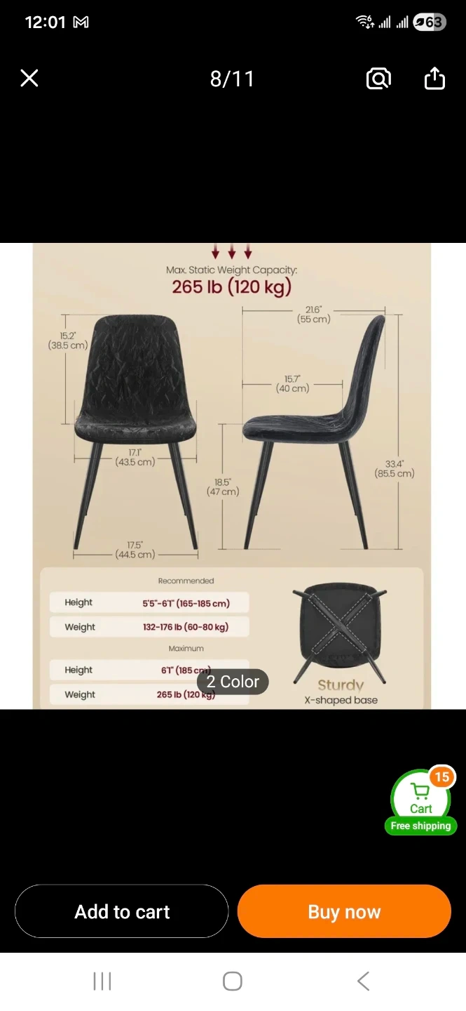 These dining chairs have a metal frame and PU leather upholstery. The seat dimensions are 17.1" (43.5 cm) wide and 15.7" (40 cm) deep. They have a sturdy x-shaped base and adjustable feet for stability. Max static weight capacity is 265 lb (120 kg)!