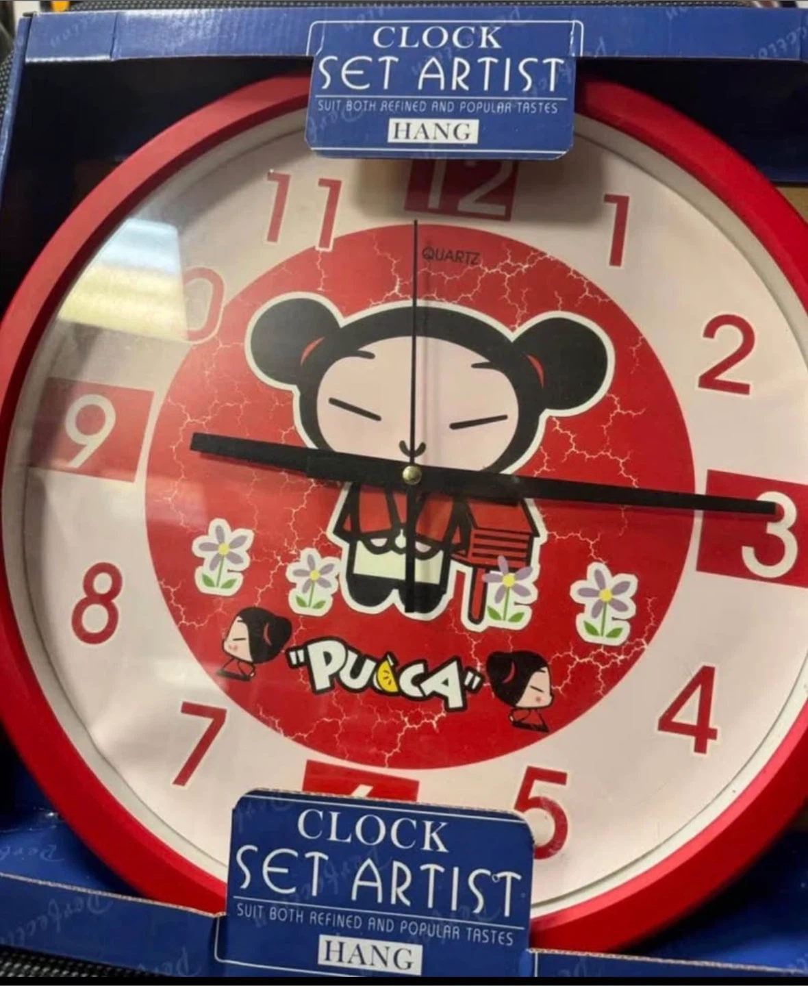 This is a red Pucca quartz wall clock from Clock Set Artist. It features the Pucca character and has large, easy-to-read numbers. It's designed for hanging and runs on quartz movement.