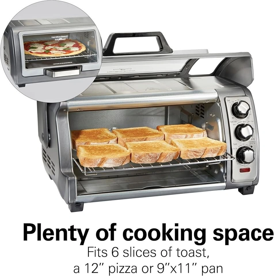 The specially designed glass door makes it easier to add and remove foods and check foods as they're cooking. It has plenty of room for 6 slices of toast, a 12" pizza, or a 9" x 11" baking pan and 2 rack positions to accommodate a variety of foods.