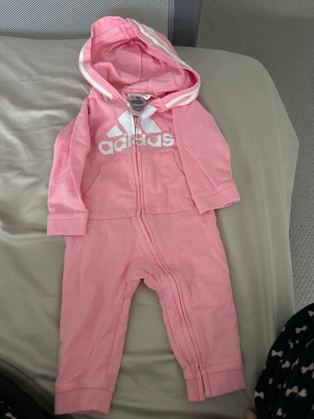 This is a baby pink Adidas onesie with a zip-up front. It has the iconic Adidas logo on the chest and the signature three stripes on the hood. Made of soft material, it's perfect for keeping little ones comfy.