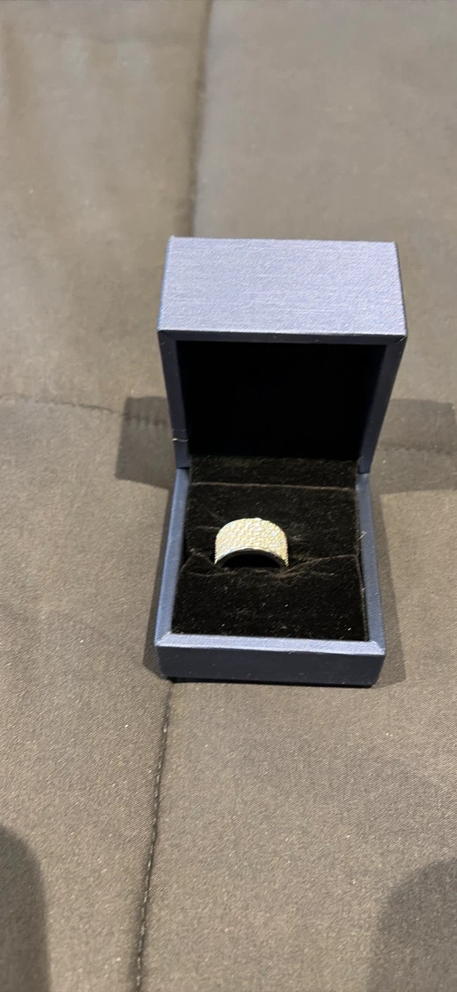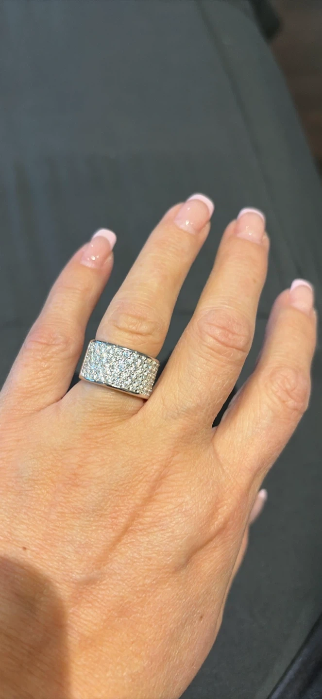 This is a wide band ring covered in small, sparkly white sapphire stones. It comes with a blue ring box for safekeeping. The ring is sterling silver-toned and has a platinum finish.
