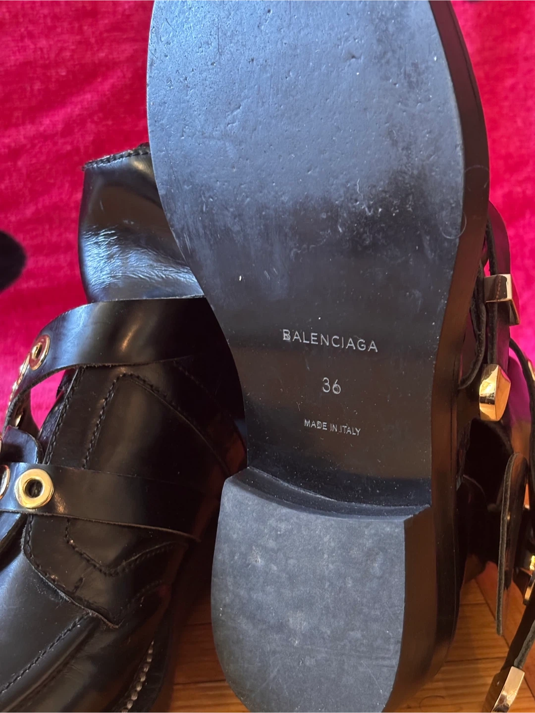 Balenciaga black leather ankle boots with buckle and strap details. Made in Italy. Size 36. These boots feature a unique design with gold-toned hardware. They're perfect for adding an edgy touch to any outfit!
