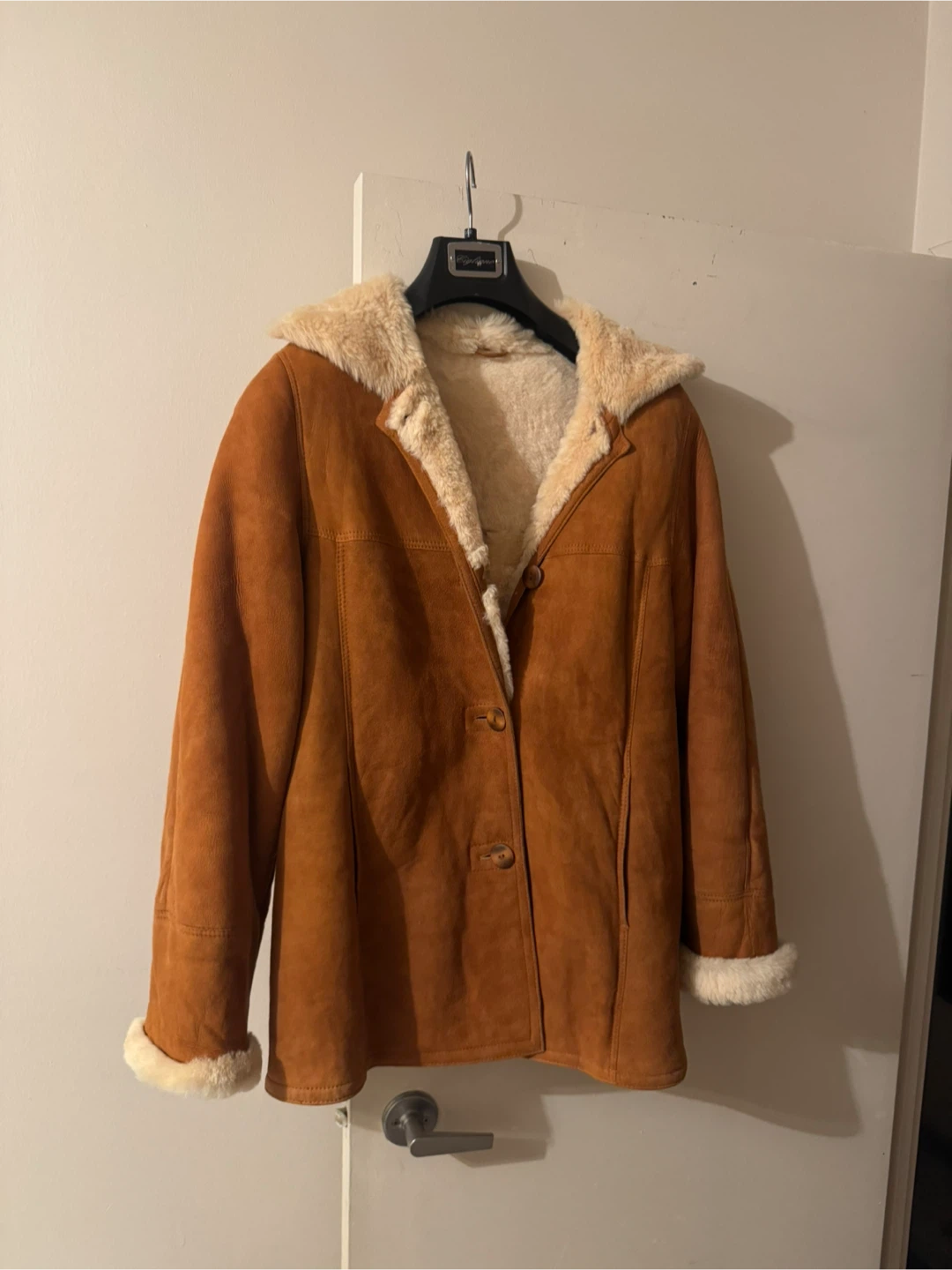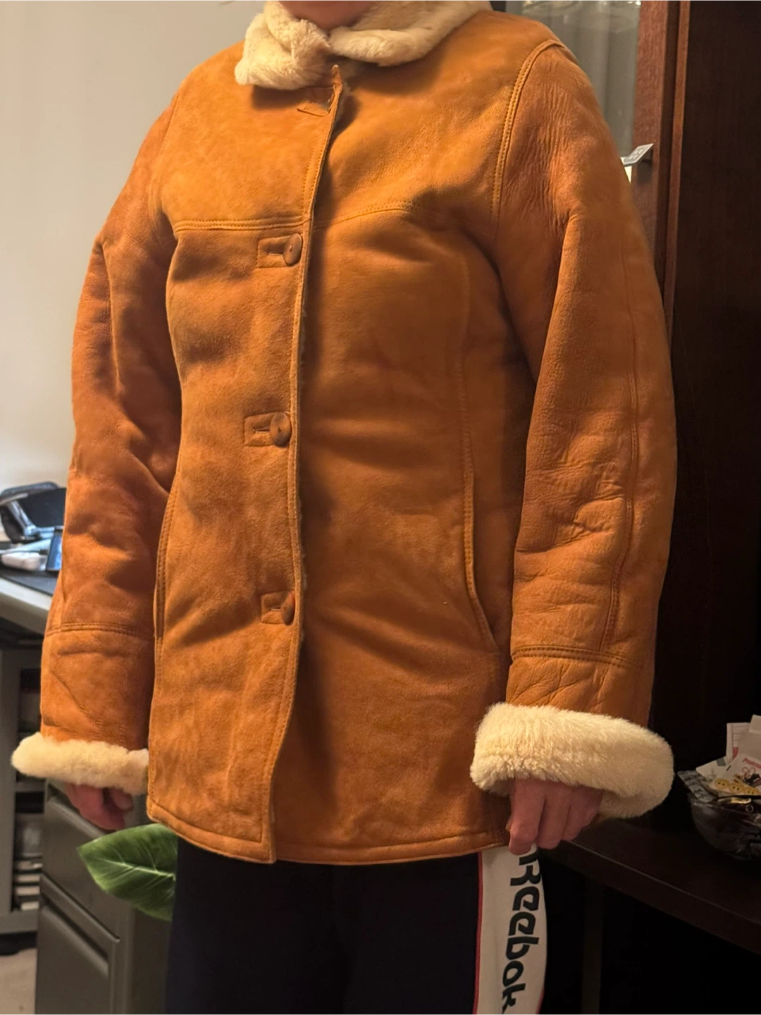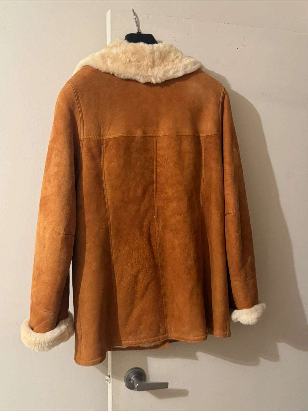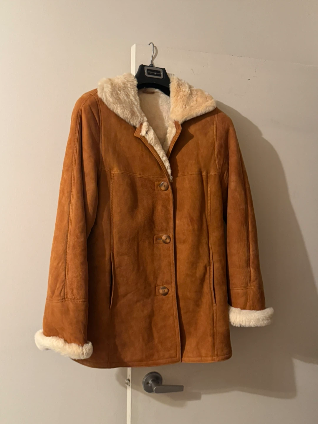 It's a warm brown suede coat with a cozy shearling lining and collar.