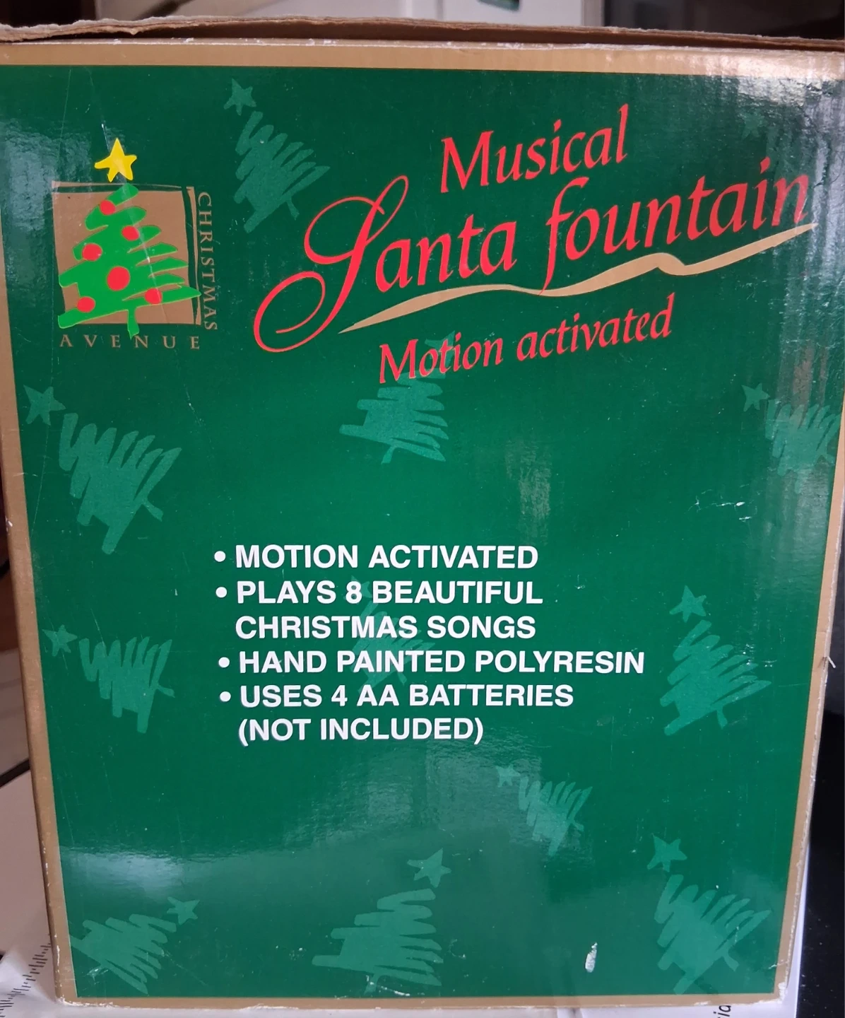 Brand New Santa Fountain. This musical Santa fountain is motion activated and plays 8 beautiful Christmas songs. It's made of hand-painted polyresin and uses 4 AA batteries, which are not included. Adds a festive touch to your holiday decor!
