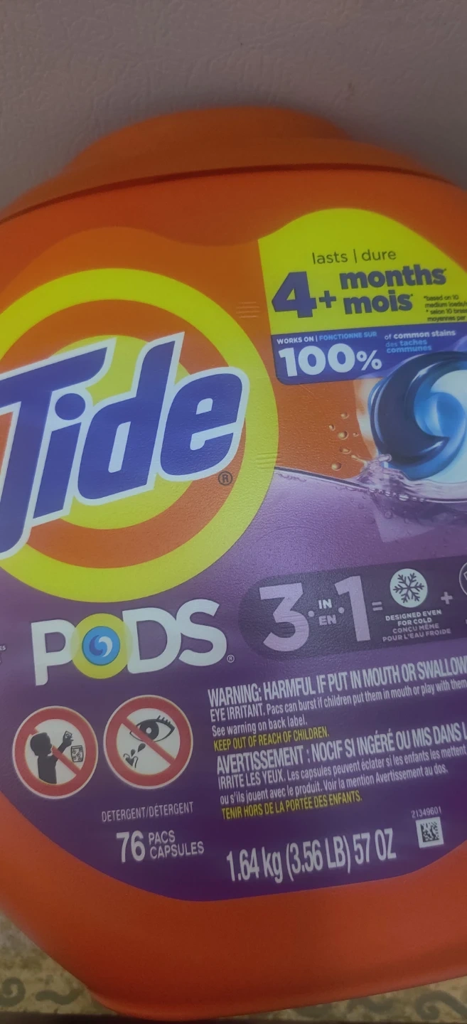 Tide Pods 3 in 1 laundry detergent comes in a Spring Meadow scent. It's designed for cold water and offers stain removal. Includes 76 pacs.