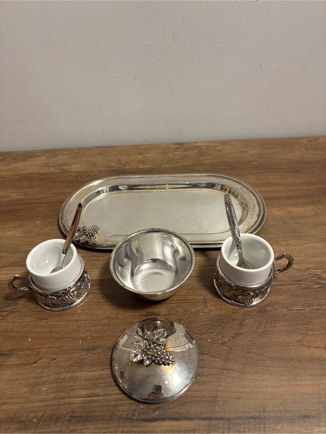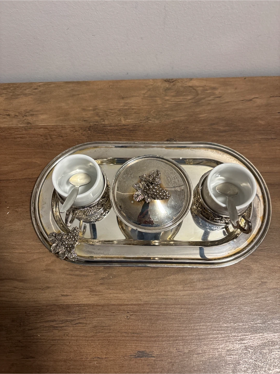 A lovely vintage coffee or tea set including two cups and saucers, a covered sugar bowl, and a serving tray. The decorative silver plating has a beautiful intricate design. It's perfect for serving a small couple or for display!