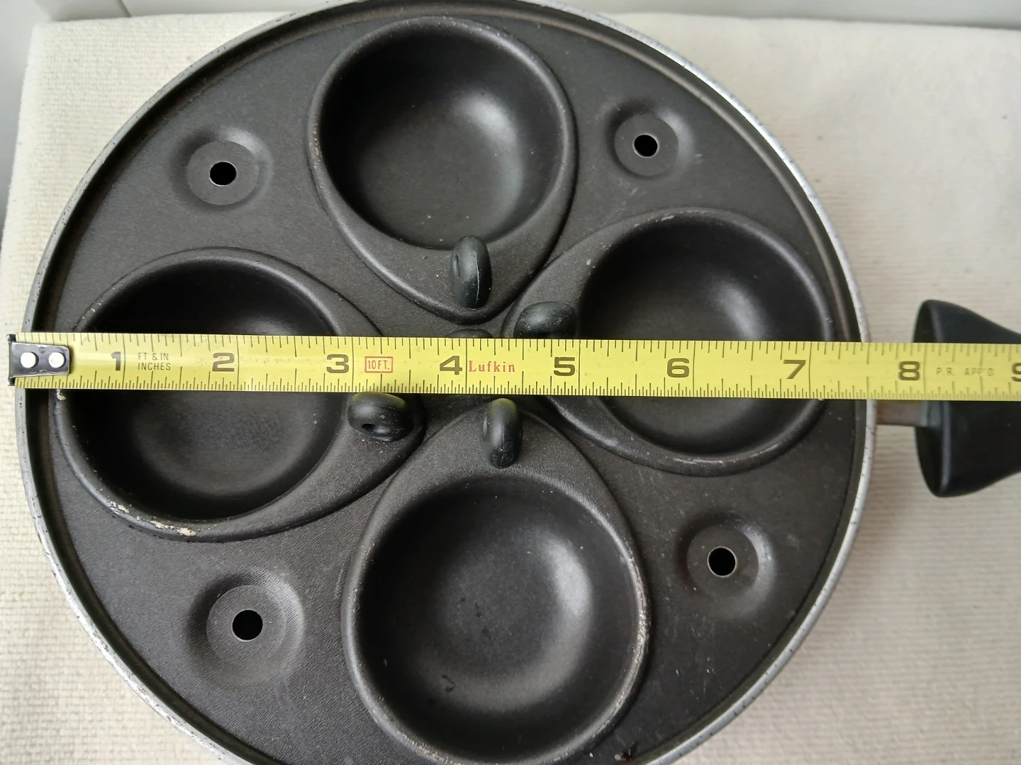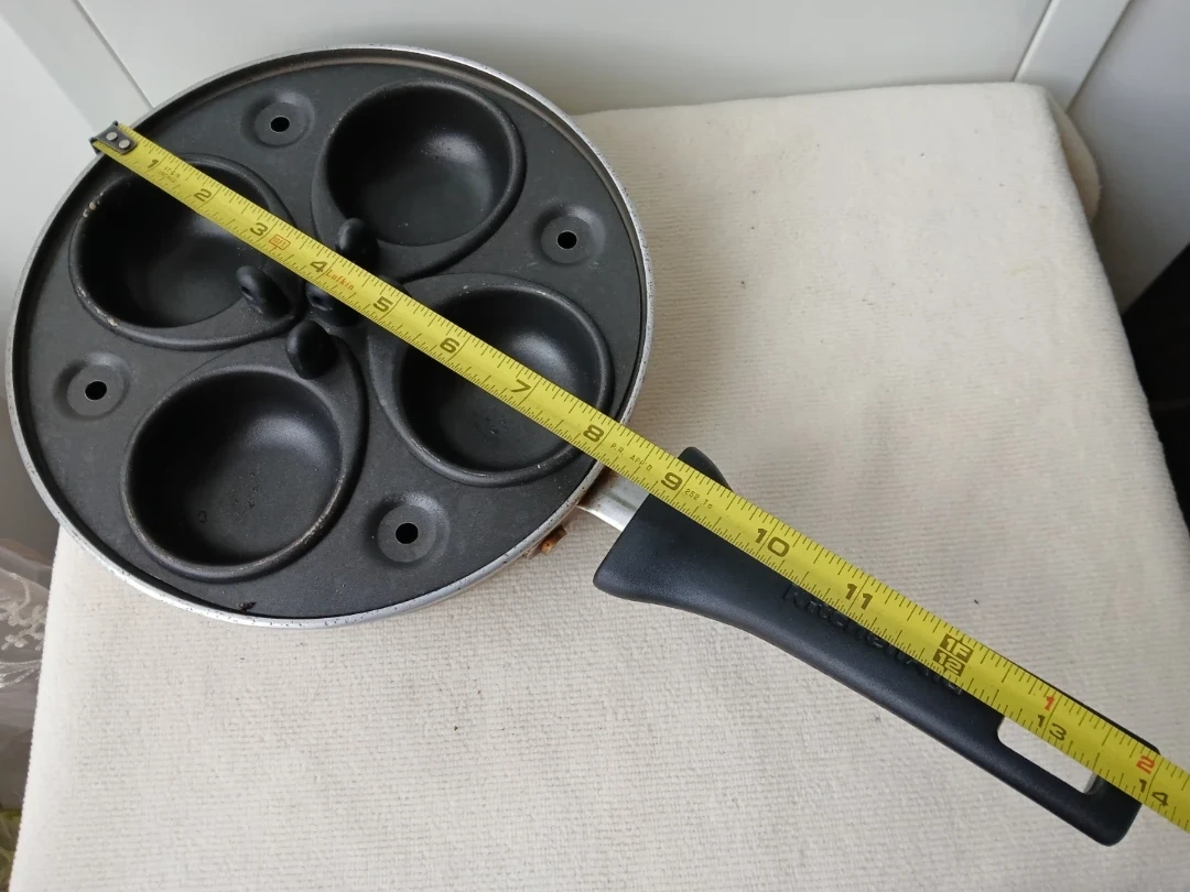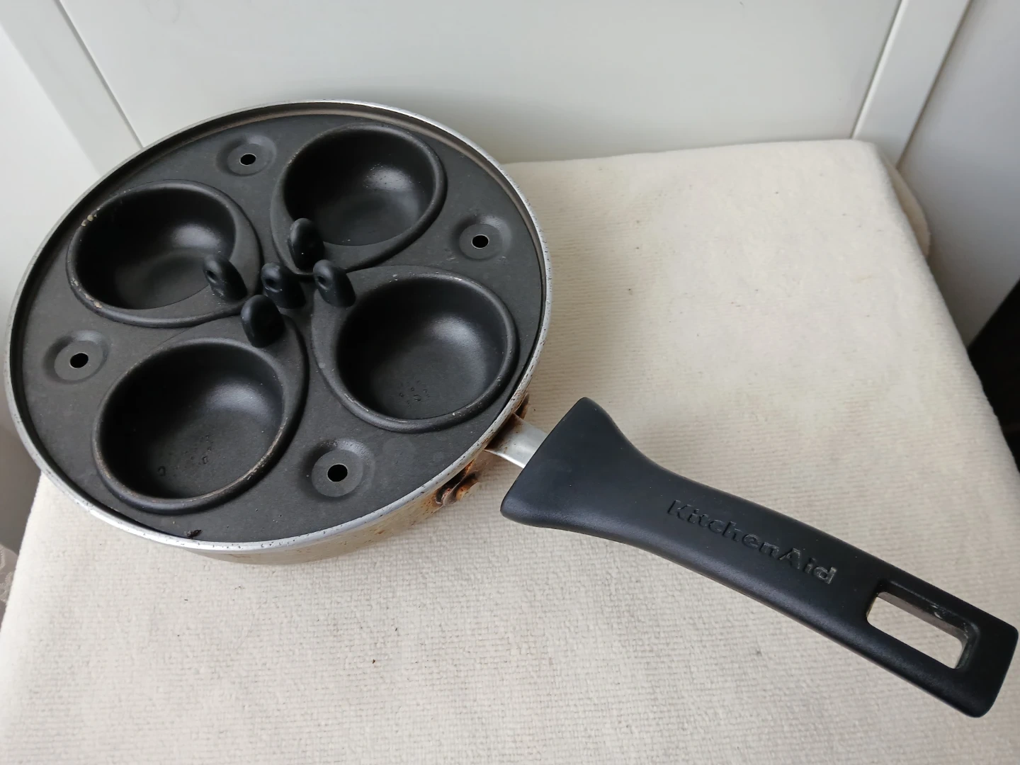 This is a KitchenAid egg poacher pan with four cups. The pan is made of metal with a black non-stick coating and a black handle. It's about 10 inches in diameter. You can use it to easily make four poached eggs at once!