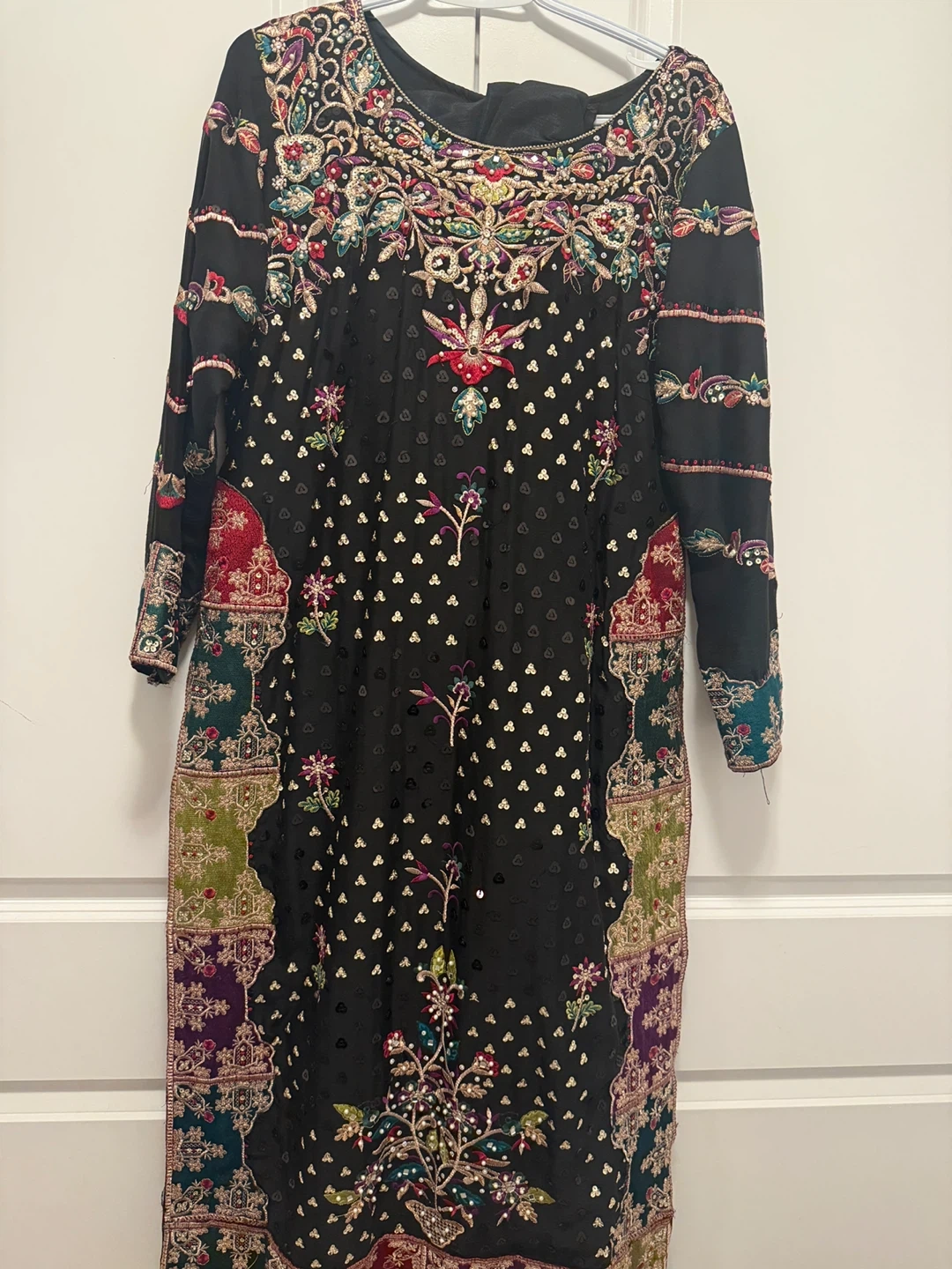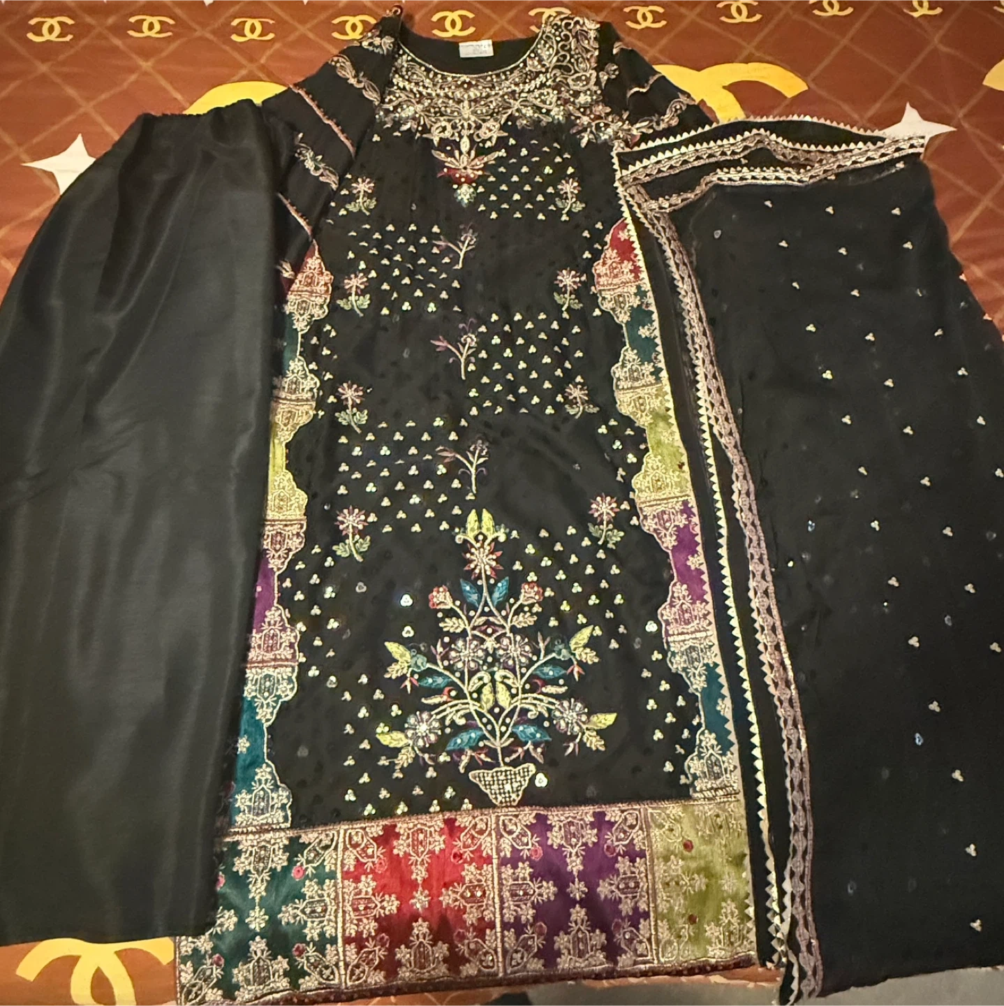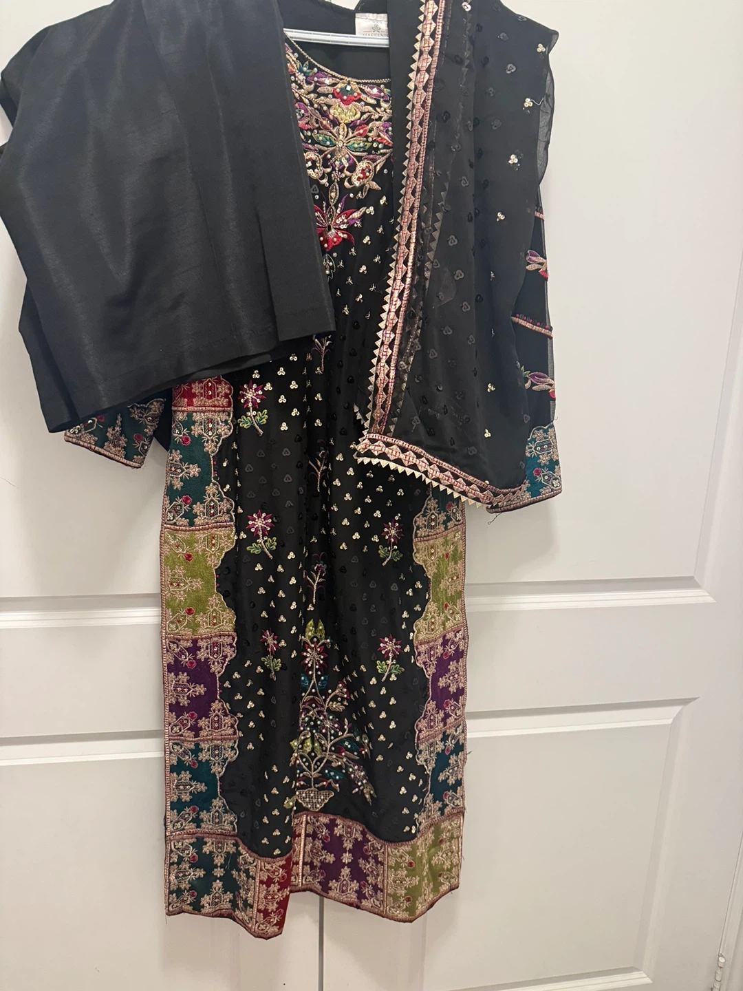 Embroidered black three-piece suit. It features intricate multi-coloured embroidery on the front, sleeves, and dupatta. Matching black trousers included. This outfit is perfect for festive occasions!