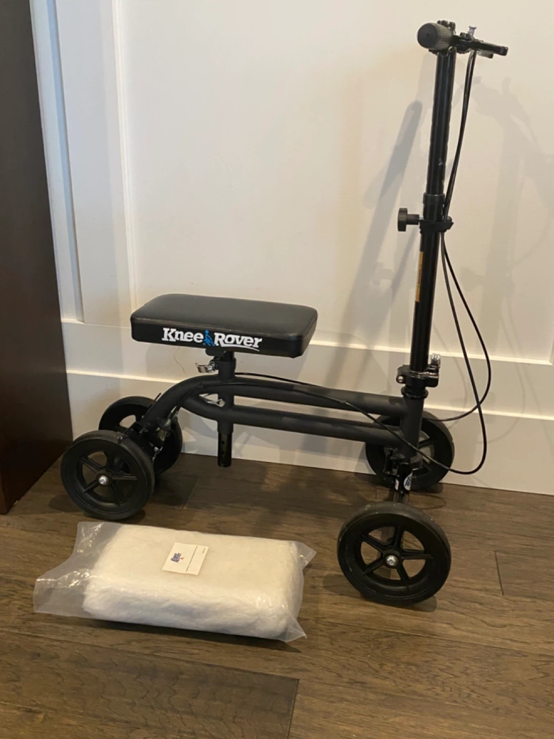 60Selling a KneeRover knee walker. It has a comfortable padded seat and adjustable handlebars. Great for getting around while recovering from a foot or ankle injury! Has brakes and an extra seat pad