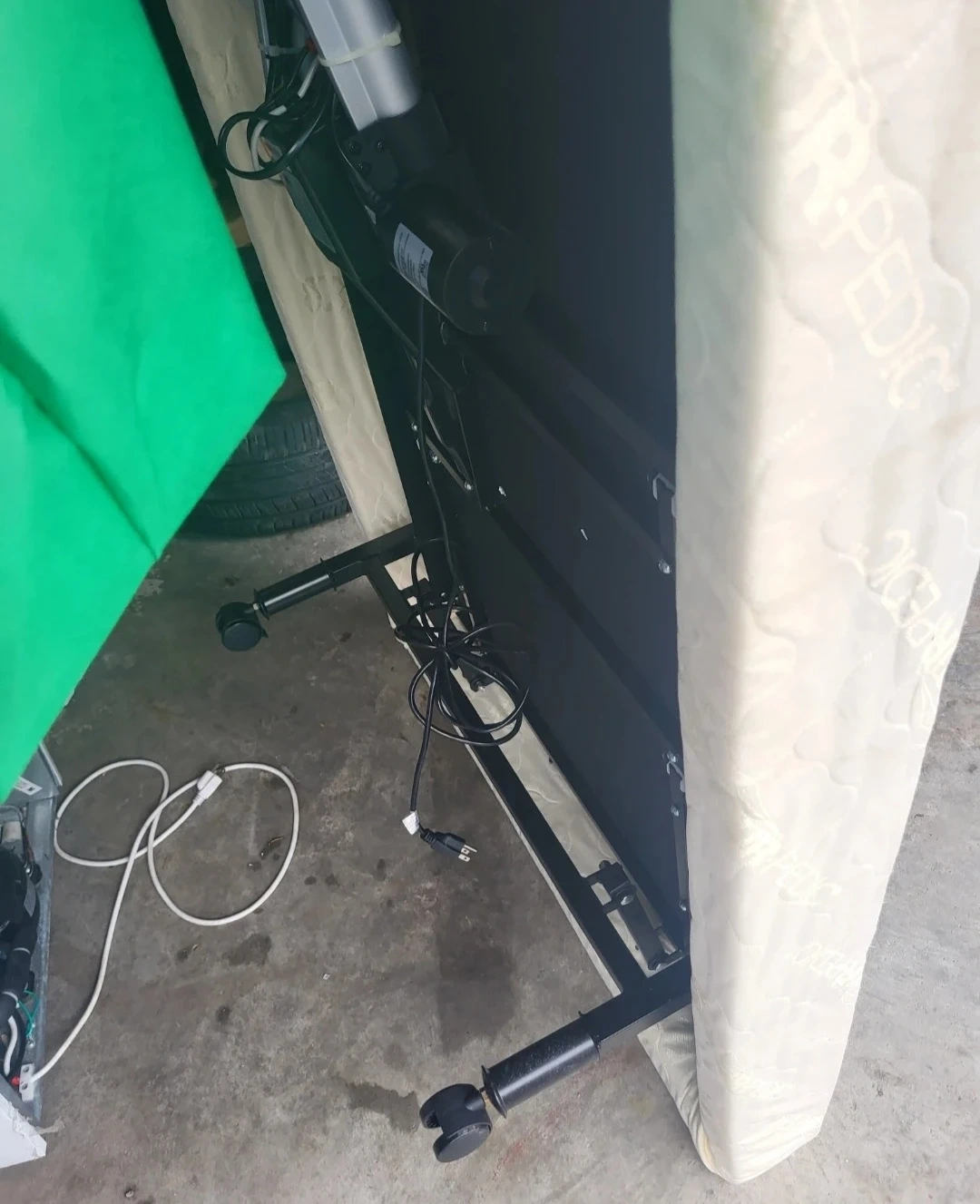 Adjustable bed base frame with wired remote control. Includes motors and frame components. It's a functional electric bed base. Matress including