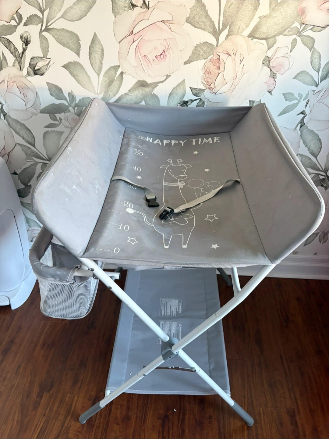 Used: Portable grey infant changing table with a safety strap and a side storage basket. Features a built-in measurement guide for tracking baby's growth. Easy to fold for storage.